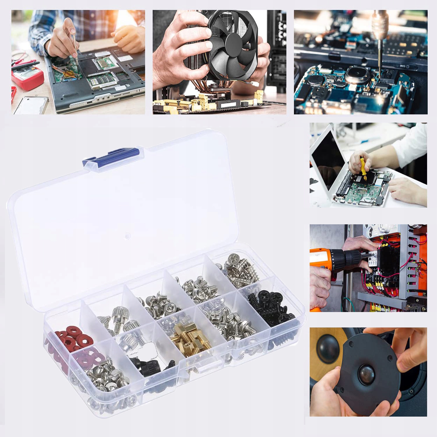 📦 KOMPLETNOŚĆ I UNIWERSALNOŚĆ: Zestaw 228 sztuk pokrywa zapotrzebowanie na śruby przy montażu obudów, płyt głównych, dysków twardych (HDD/SSD), zasilaczy, wentylatorów chłodzenia, kart graficznych oraz naprawie laptopów.