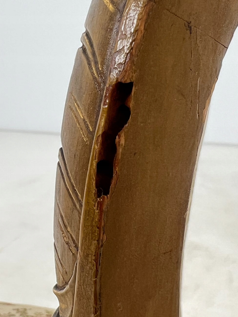 - Uwagi: widoczne są zarysowania, wgniecenia i uszkodzenia na ramach i nogach obu krzeseł. Tapicerka oparć obu krzeseł jest podarta., Tapicerka siedziska jednego krzesła jest zabrudzona. Wysokość siedziska 49 cm.