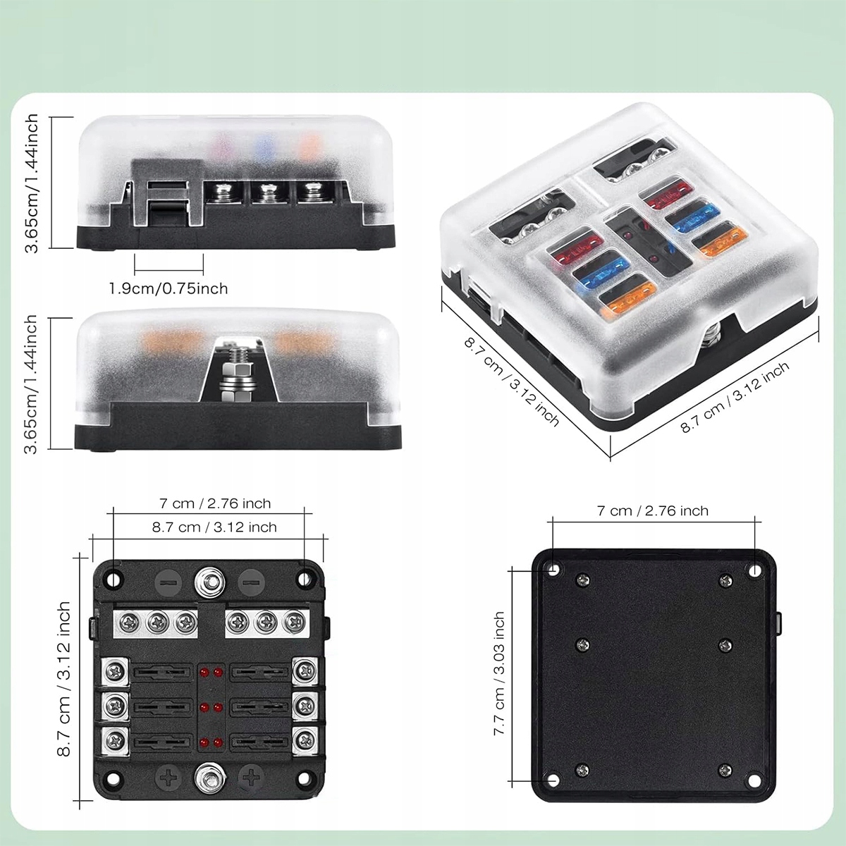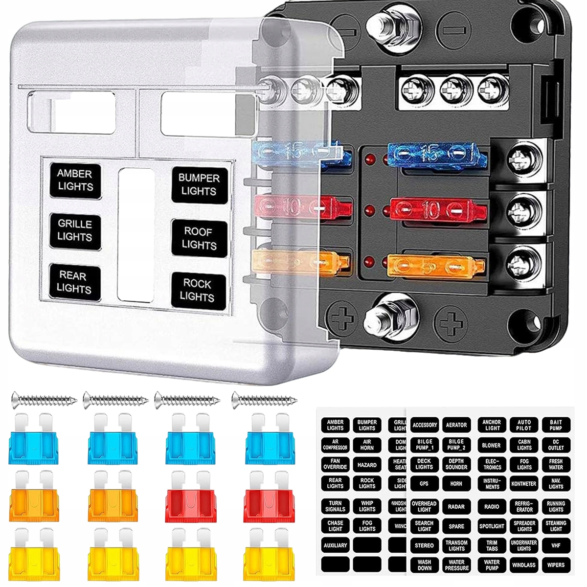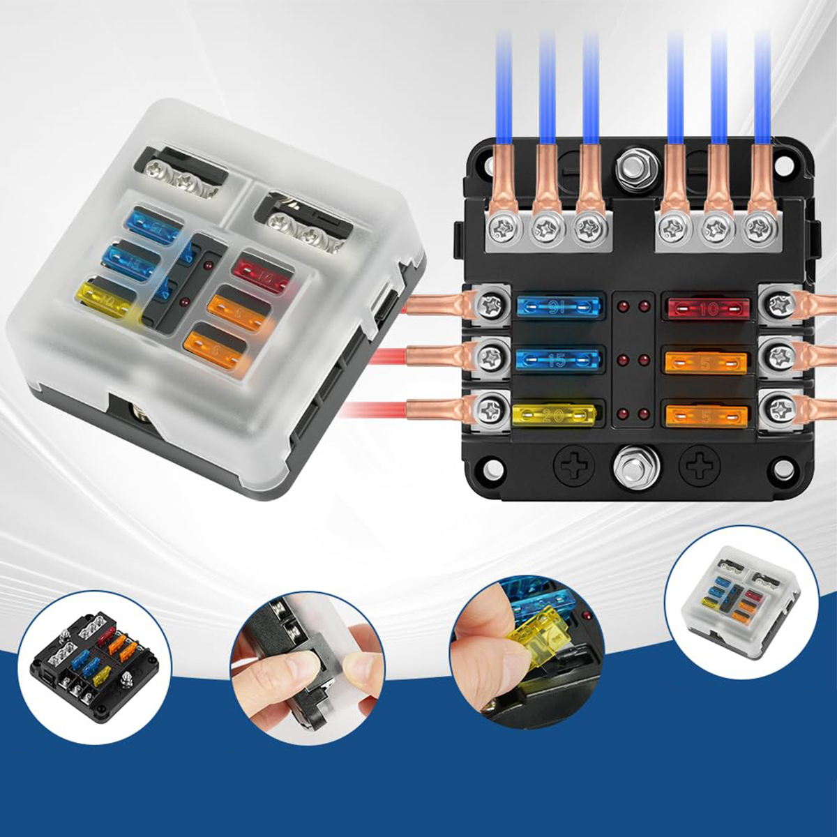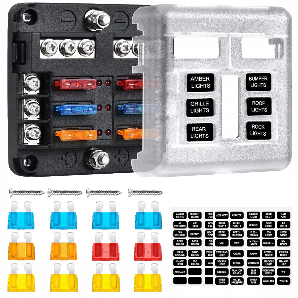 Ten uchwyt bezpiecznika posiada 6 obwodów elektrycznych z diodami LED do szybkiego wykrywania usterek i może być stosowany w samochodach, autobusach, cysternach, łodziach, statkach, ciężarówkach, SUV-ach, jachtach, kamperach, statkach itp.