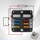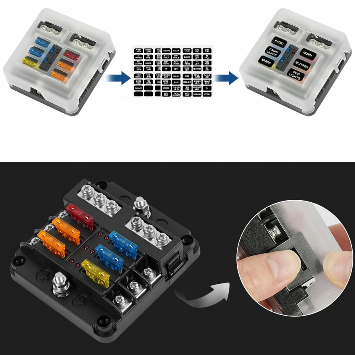 Ta skrzynka bezpieczników jest wyposażona w 6 obwodów elektrycznych i diodę LED ostrzegawczą. Gdy bezpiecznik się przepali, natychmiast zapala się czerwona dioda LED ostrzegawcza. Jest to inteligentny i niezawodny system, który natychmiast informuje o stanie bezpiecznika. Za pomocą lampek ostrzegawczych LED można łatwo sprawdzić i wymienić przepalone bezpieczniki.