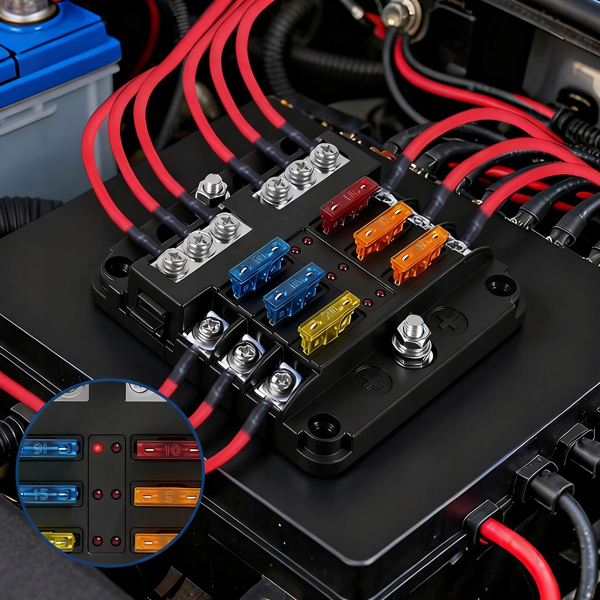 Ten płaski blok bezpieczników został specjalnie zaprojektowany do bezpieczników ATC/ATO (bezpieczniki średniej wielkości). Zapewnia doskonałą ochronę obwodów niskiego napięcia. Każda śruba zacisku dodatniego ma odpowiadającą jej śrubę zacisku ujemnego. Dzięki temu okablowanie jest przejrzyste i uporządkowane, co stanowi idealne rozwiązanie do organizacji i ochrony labiryntu przewodów niskiego napięcia w pojeździe.