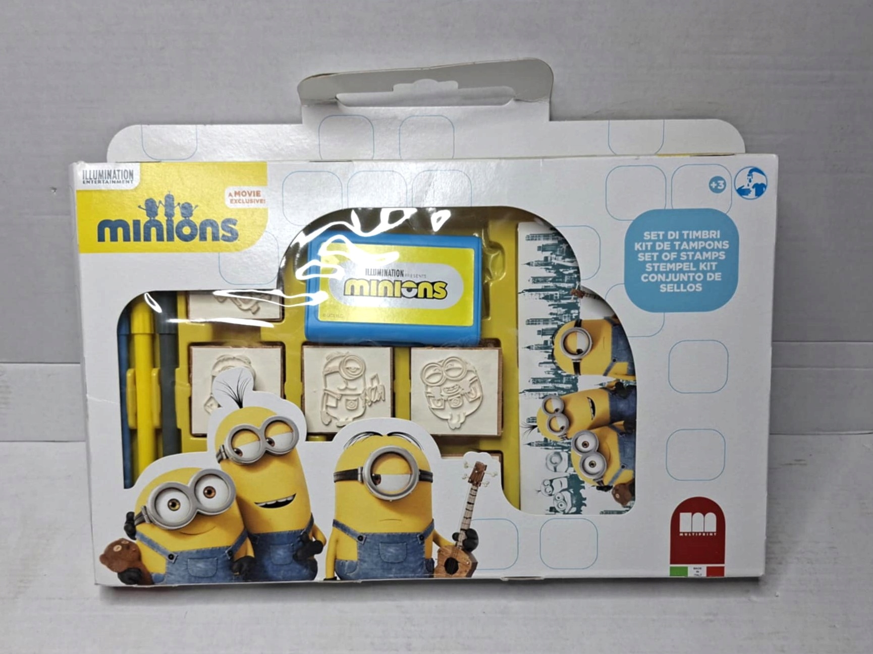 Pieczątki na licencji Minionki. W skład zestawu wchodzą: 7 pieczątek, 3 pisaki, 1 poduszeczka do tuszu i 1 notatnik.