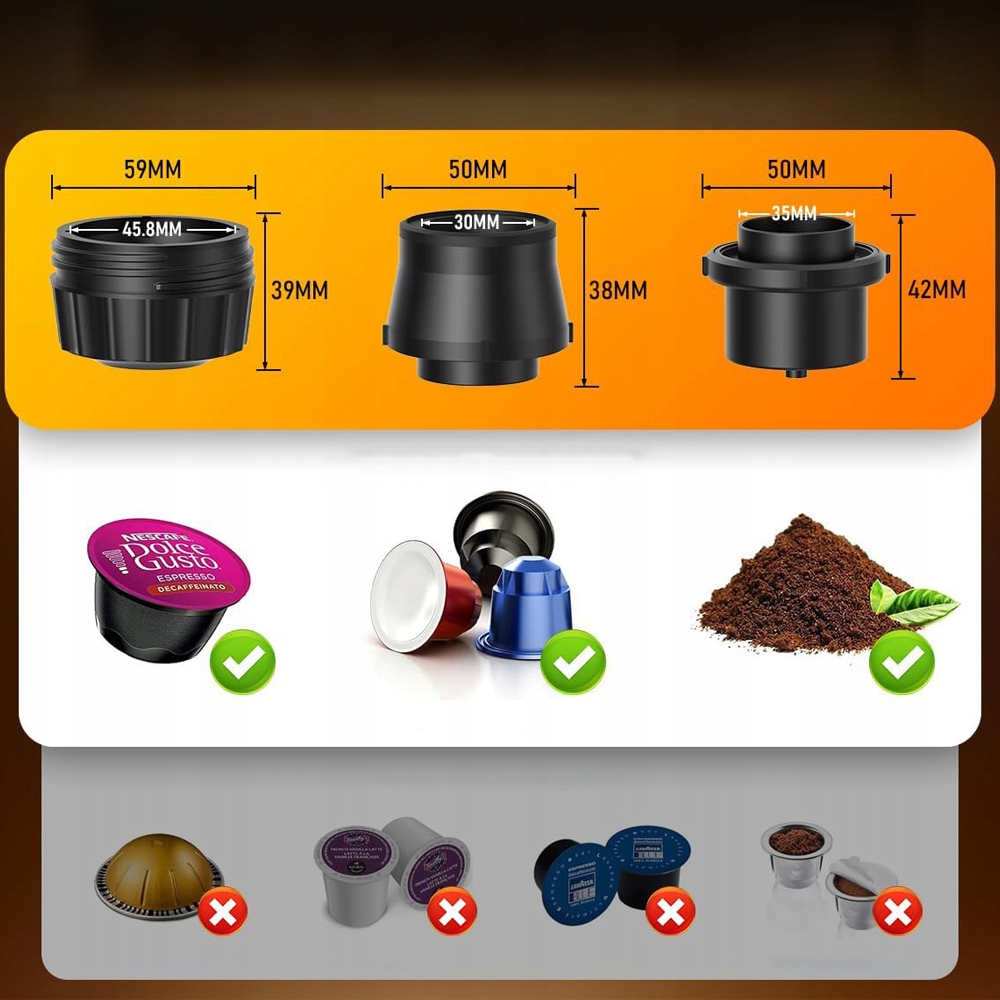 💝TWOJA KAWA, TWOJE ZASADY:Maszyna jest kompatybilna zarówno z mieloną kawą, jak i wieloma popularnymi kapsułkami. Możesz także przygotowywać gorące lub zimne napoje. Dołączony, wielorazowy filtr jest ekologiczny i łatwy do płukania. ♻️