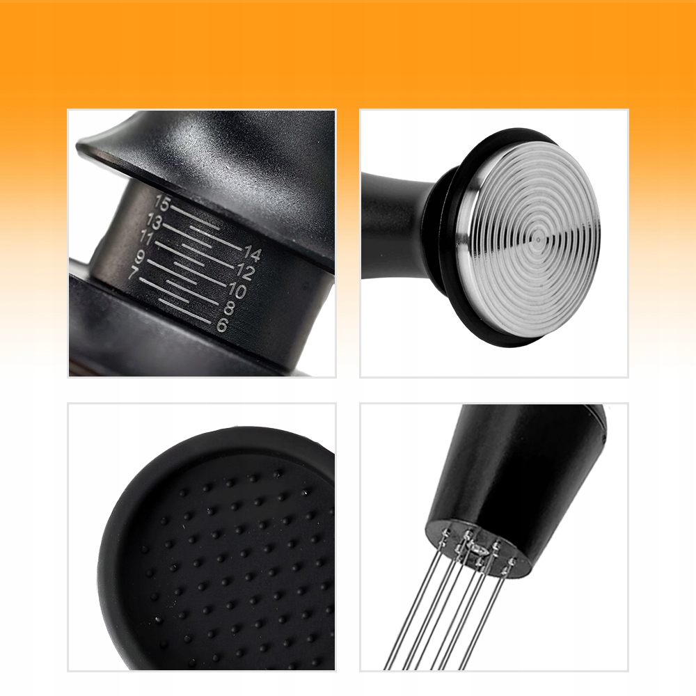 Zestaw zawiera ubijak do kawy o średnicy 51 mm, czarną matę z tkaniny oraz czarną silikonową podkładkę. Jest bardziej kompleksowy niż większość zestawów dostępnych na rynku i nie wymaga dodatkowych akcesoriów. Nasz ubijak do kawy charakteryzuje się innowacyjną konstrukcją z wbudowaną sprężyną; nacisk automatycznie się odbija bez konieczności dodatkowej regulacji. Wyraźne podziałki na ubijaku zapewniają spójne wyniki ubijania za każdym razem.