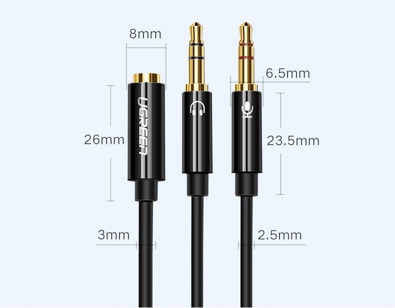 Rozdzielacz słuchawkowy marki Ugreen uumożliwia podłączenie słuchawek ze zintegrowanym mikrofonem i pojedynczym złączem 3,5 mm mini jack do dwóch portów 3,5 mm mini jack (osobno słuchawki i mikrofon). Obydwie wtyczki zostały intuicyjnie oznakowane ikonami mikrofonu i słuchawek, aby każdy szybko poradził sobie z podłączeniem sprzętu.