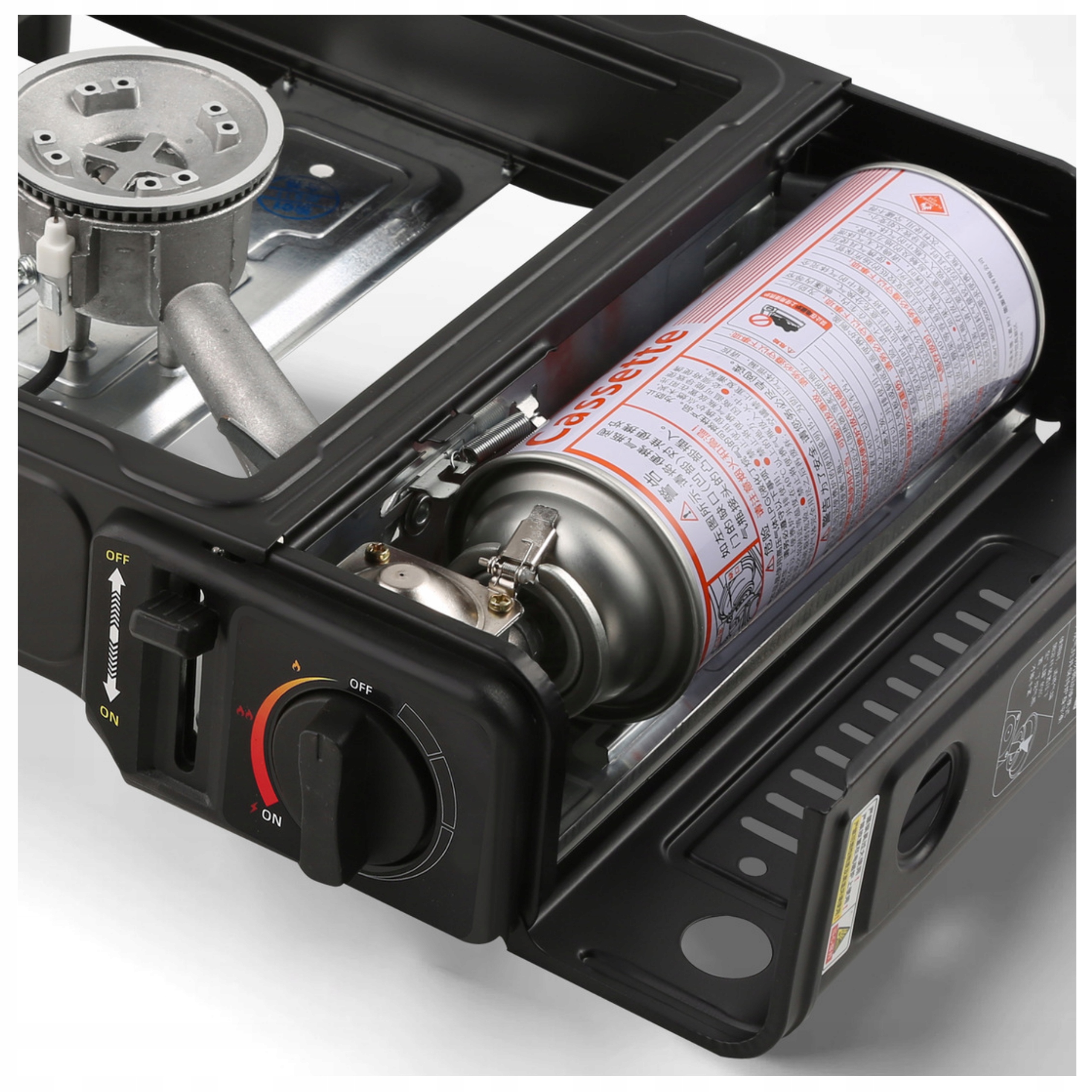 System bezpieczeństwa pozwala łatwo zamontować kartusz oraz uniemożliwia jego nieprawidłowe podłączenie. Kuchenka uruchamia się jednym ruchem dzięki zapłonowi piezoelektrycznemu, co znacznie ułatwia użytkowanie w terenie.
