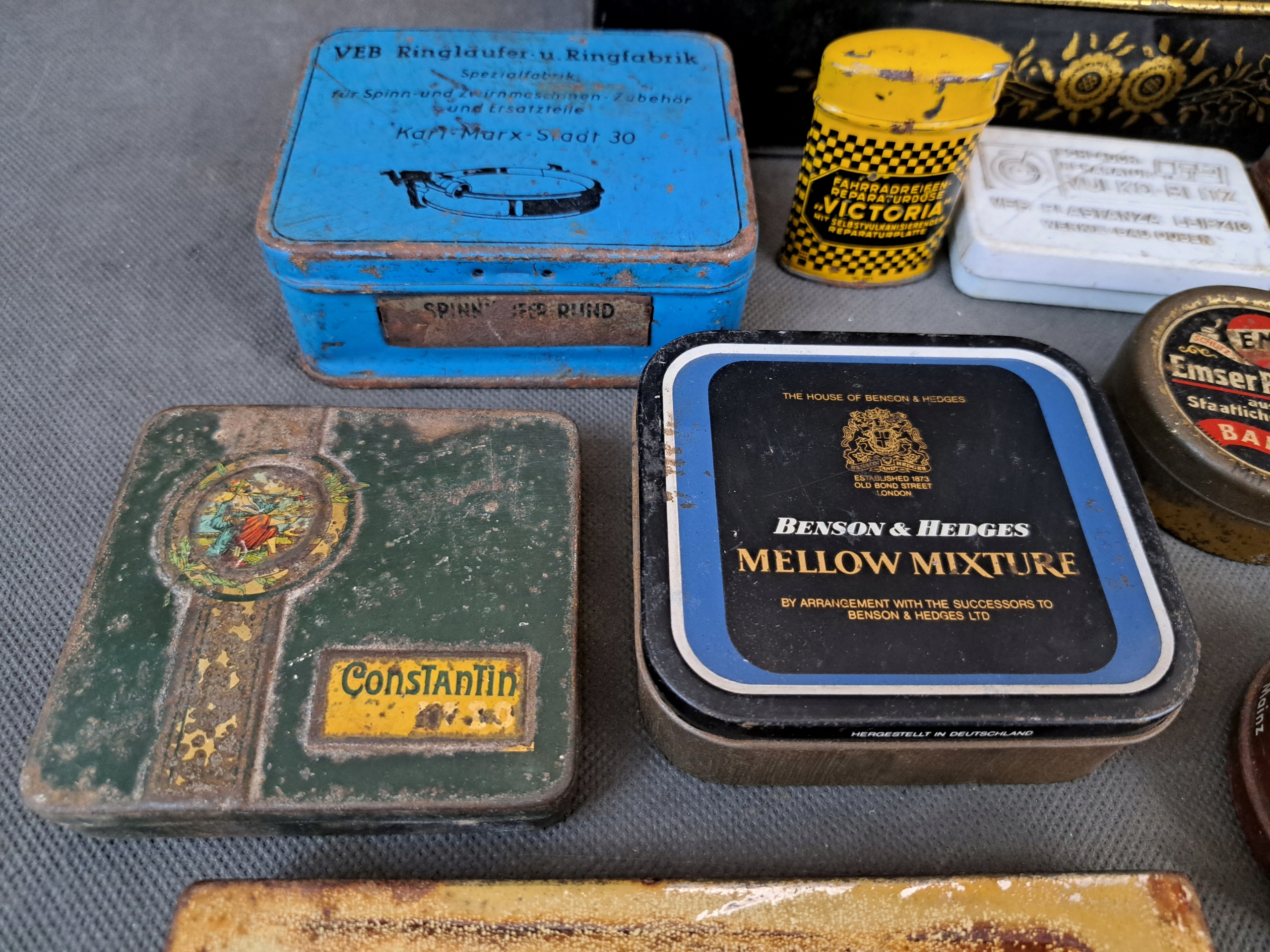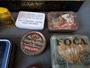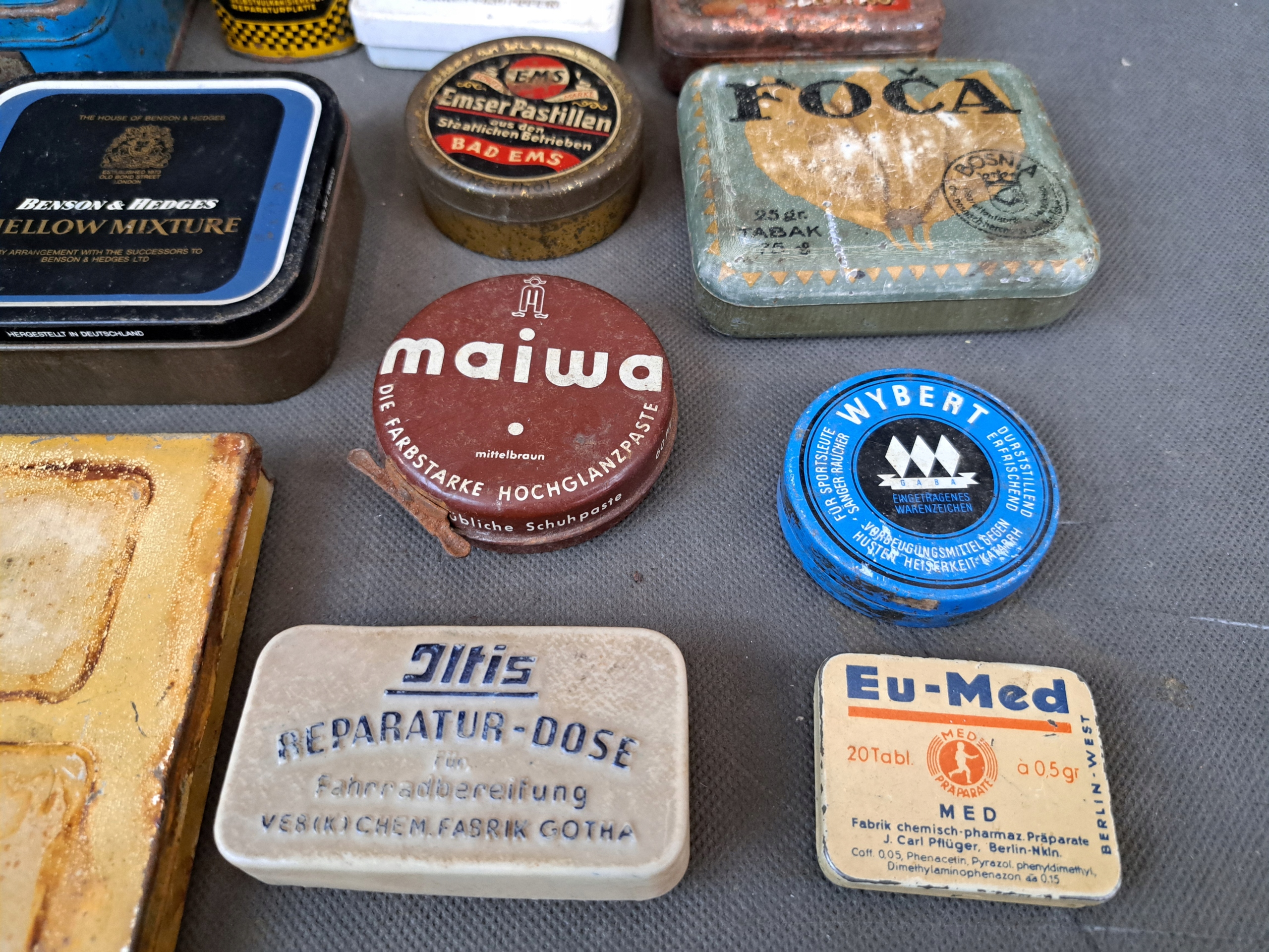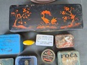Zestaw piętnastu starych pudełek, różnej wielkości.