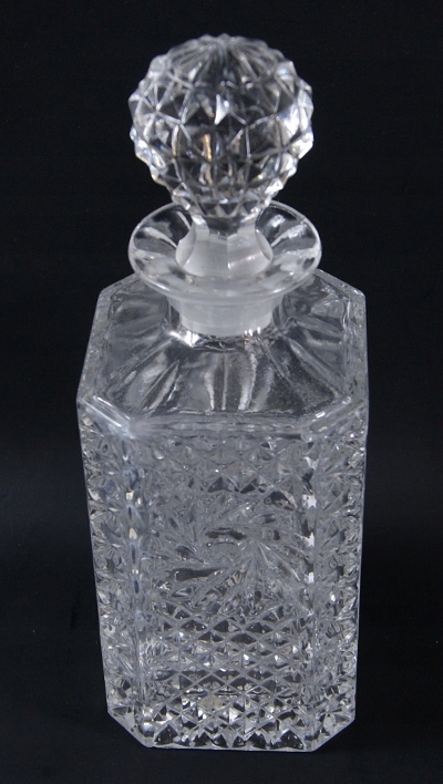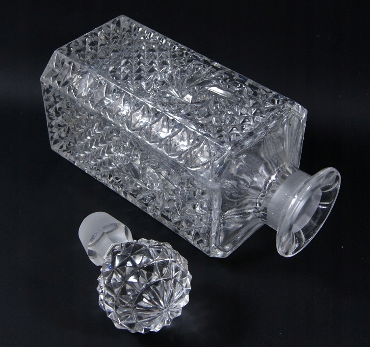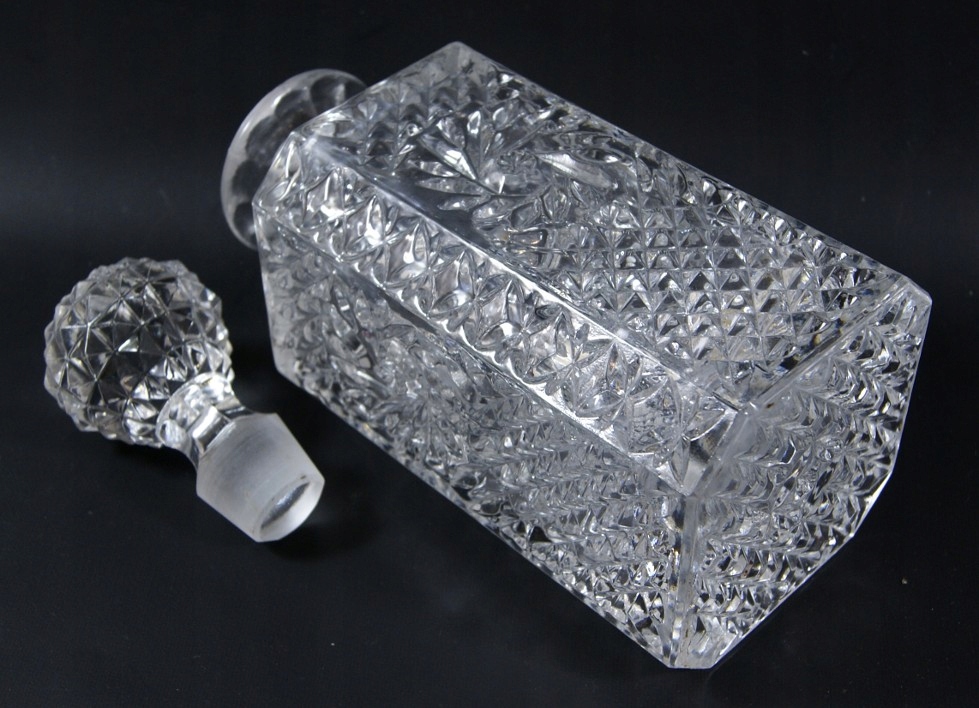 Śliczna, stara karafka wykonana z grubego, bezbarwnego szkła kryształowego, korek pełny.