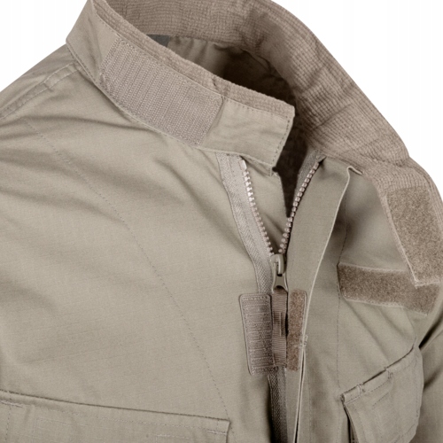 Wentylacja i komfort użytkowania. Zamki wentylacyjne pod pachami pozostają w zasięgu ręki, nawet gdy użytkownik nosi plecak lub kamizelkę taktyczną. To rozwiązanie zwiększa komfort i umożliwia szybkie odprowadzenie nadmiaru ciepła podczas intensywnego wysiłku.