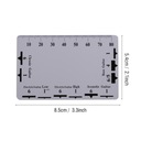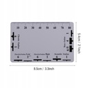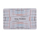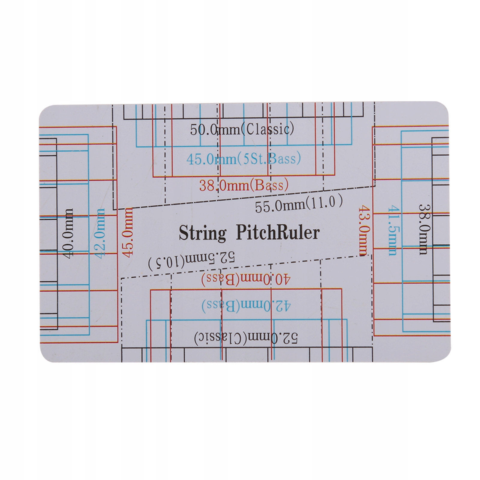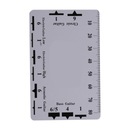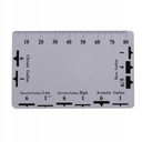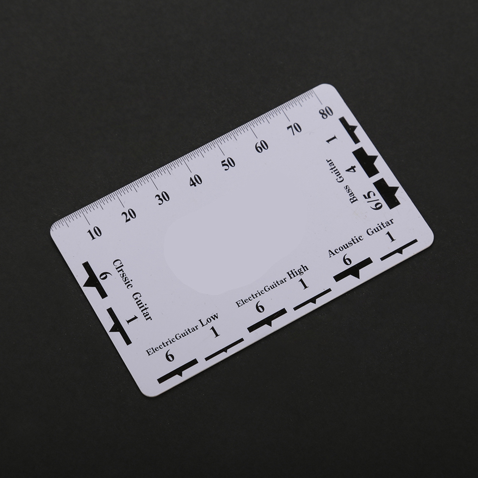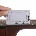 Dwustronna linijka zawiera tabelę konwersji akcji strun na 12. progu oraz dokadną skalę do pomiaru wysokości strun i wysokości siodeka mostka.