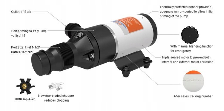Profesjonalna pompa z rozdrabniaczem SEAFLO SFMP1-120-01 to niezawodne rozwiązanie do odprowadzania fekaliów i ścieków z toalet oraz kuchni w jachtach, kamperach, przyczepach kempingowych i łodziach. Idealna wszędzie tam, gdzie odpływ wymaga tłoczenia na wyższy poziom — nawet do 5 metrów.
