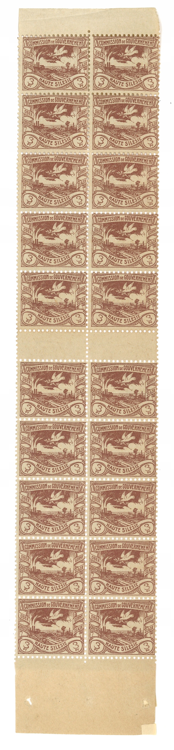20 czystych znaczków w bloku po 3 pf z Górnego Śląska. Ślad podlepki na marginesie. Rok 1920