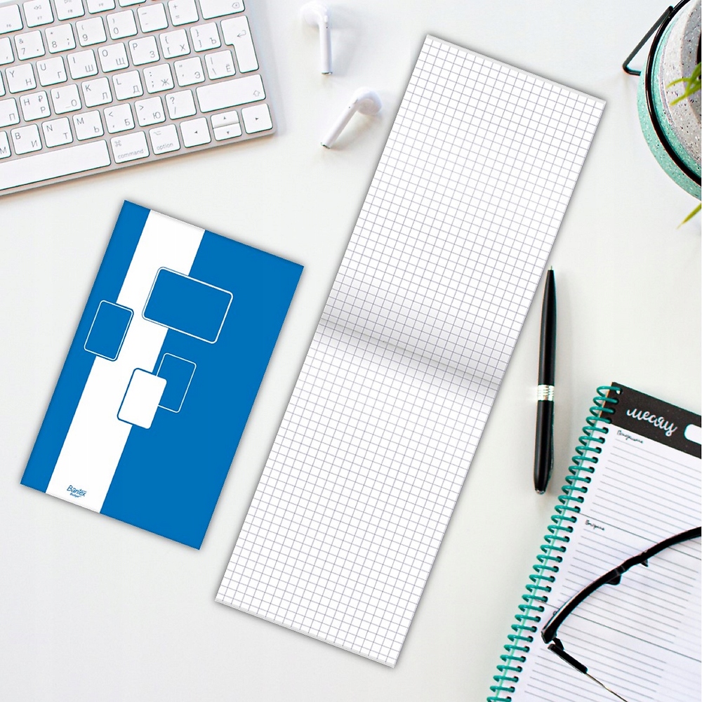 Funkcjonalny, lekki blok notatnikowy w fioletową kratkę.