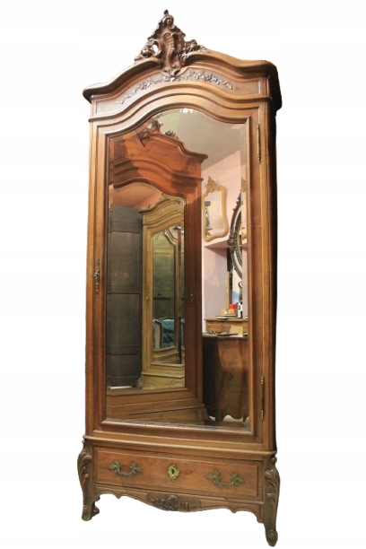 Do sprzedania posiadam ludwikowską szafę 1 drzwiową Rocaille bogato zdobioną. Szafa w bardzo dobrym stanie, początek lat 1900-tnych. Lustro w drzwiach kryształowe z fazowanymi bokami. W środku półki posiadające regulację wysokości. Wymiary; wysokość -244 cm, szerokość -100 cm, szerokość części środkowej - 90 cm, głębokość -49 cm (wymiary zewnętrzne ). MOŻLIWY TRANSPORT MAŁĄ FIRMĄ TRANSPORTOWĄ .