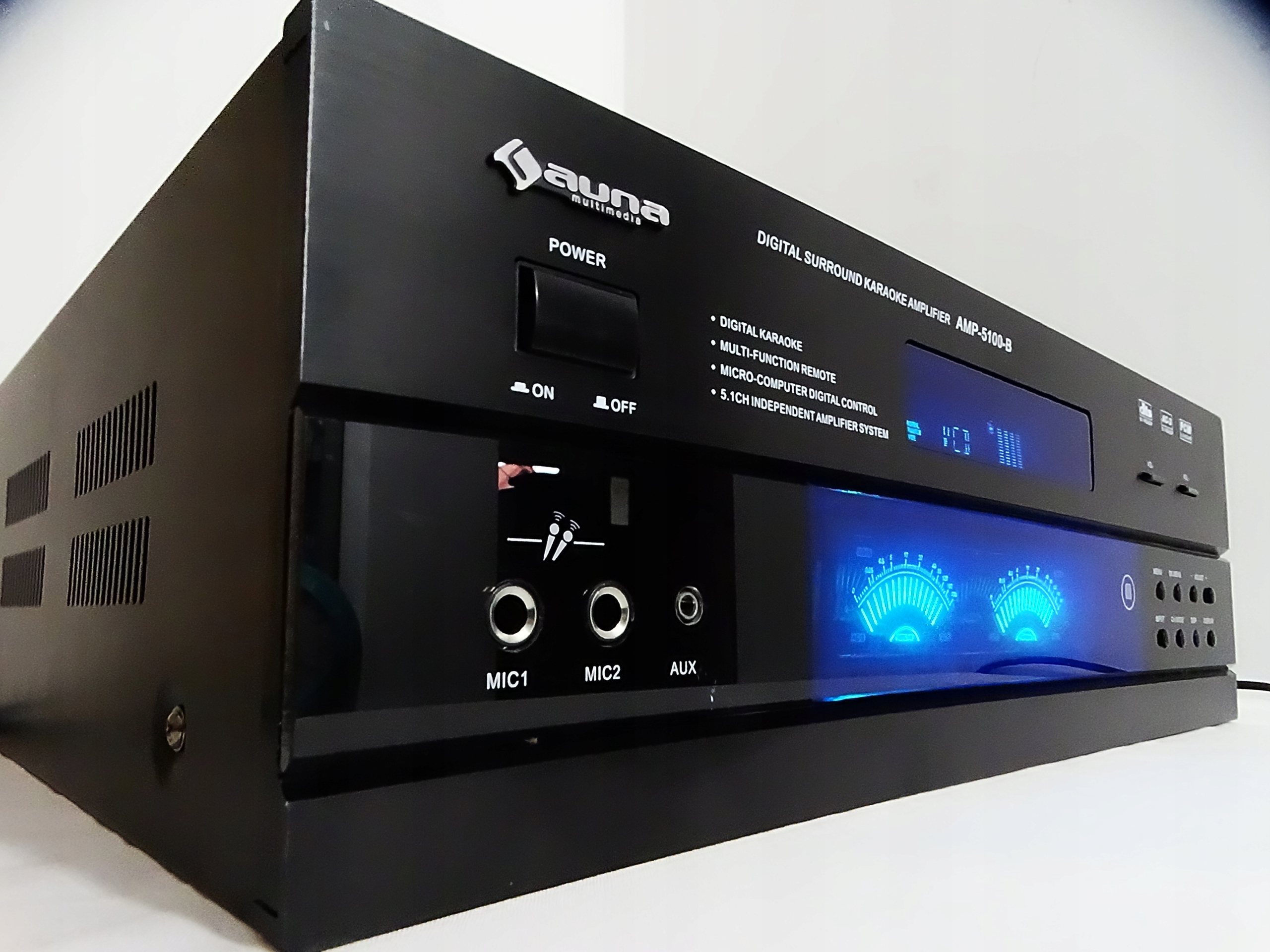 Auna AMP-5100 jest genialnym wzmacniaczem surround 5.1 będącym siłą napędową w nowoczesnych systemach multimedialnych, kompetentnie obsługującym seanse kina domowego i HiFi. Końcówka mocy HiFi obsługuje system kina domowego z mocą szczytową 1200W. Sygnał dźwiękowy pobierany jest, przez przystosowane do obsługi systemu surround, urządzenie z wbudowanym wejściem optycznym, trzema wejściami coaxialnycmih lub z kompletu wyjść systemu 5.1 -co pozwala na komunikację z konsolami high-end, odtwarzaczami Blue-Ray i DVD. Ponadto Auna AMP-5100-B posiada wbudowane wejścia cinch (RCA) i jack do obsługi odtwarzaczy CD, MP3 i podobnych komponentów HiFi. Pakiet funkcji wzmacniacza surround dopełniony jest przez zintegrowany radioodbiornik. Sensownym uzupełnieniem funkcjonalności kina domowego i HiFi są wbudowane z przodu urządzenia wejścia mikrofonowe umożliwiające zastosowanie wzmacniacza Auna do nagłośnienia imprez karaoke, konferencji lub akcji promocyjnych. Ze swoją mocą 1200W wzmacniacz Auna prezentuje wystarczająco wysoki poziom dźwięku, by dobrze nagłaśniać większe wydarzenia o charakterze prywatnym czy komercyjnym. Połyskująca płyta frontowa ze szczotkowanego aluminium z animowanym ekranem w połączeniu z czarną obudową znakomicie dopasowuje urządzenie do każdego wystroju wnętrz.