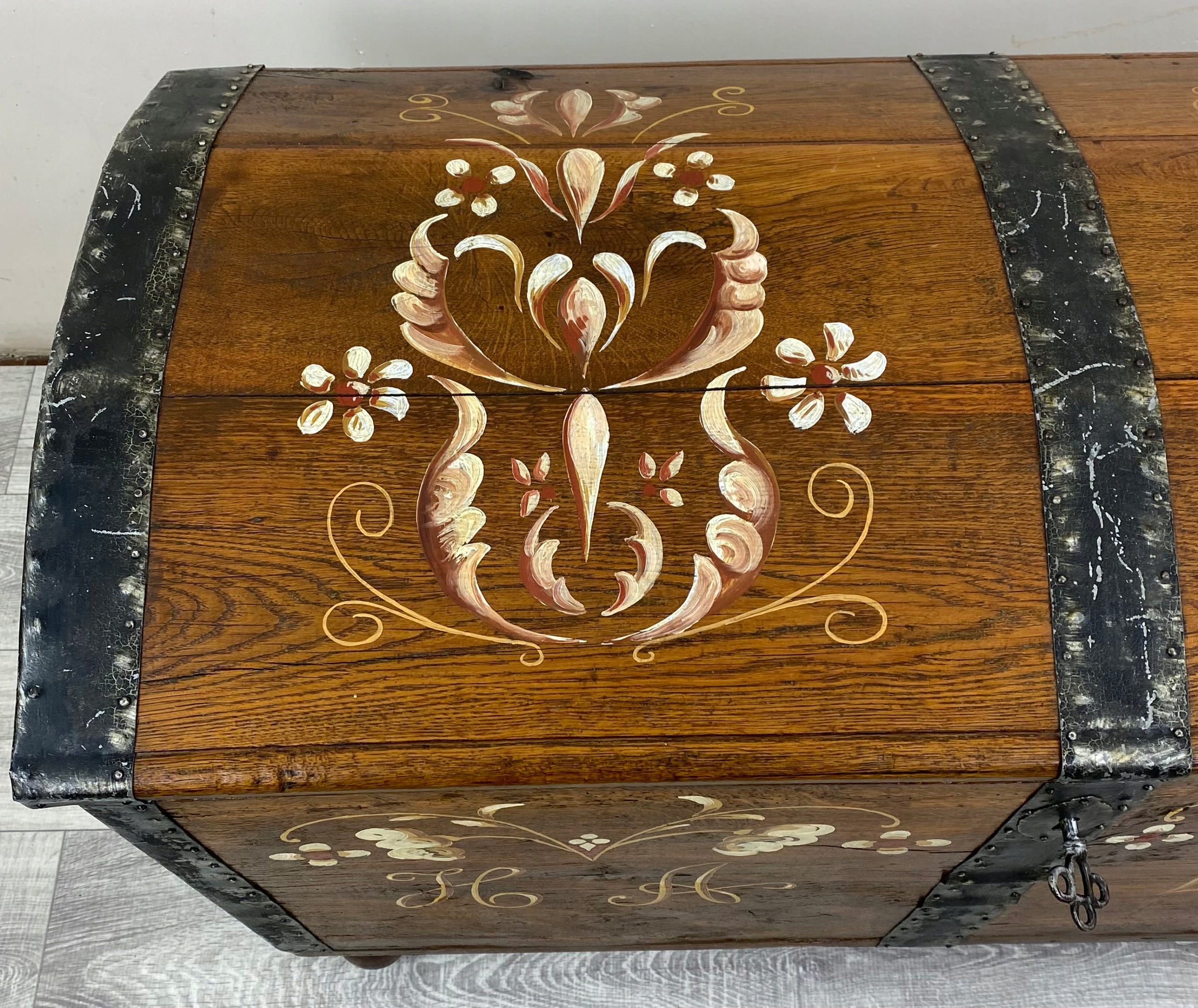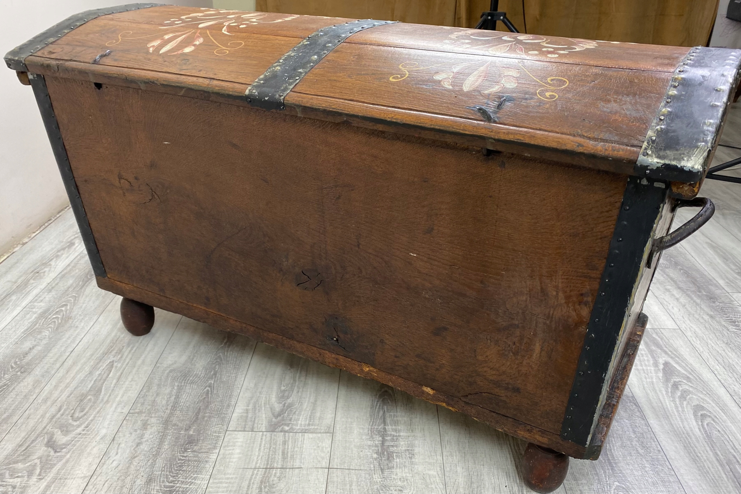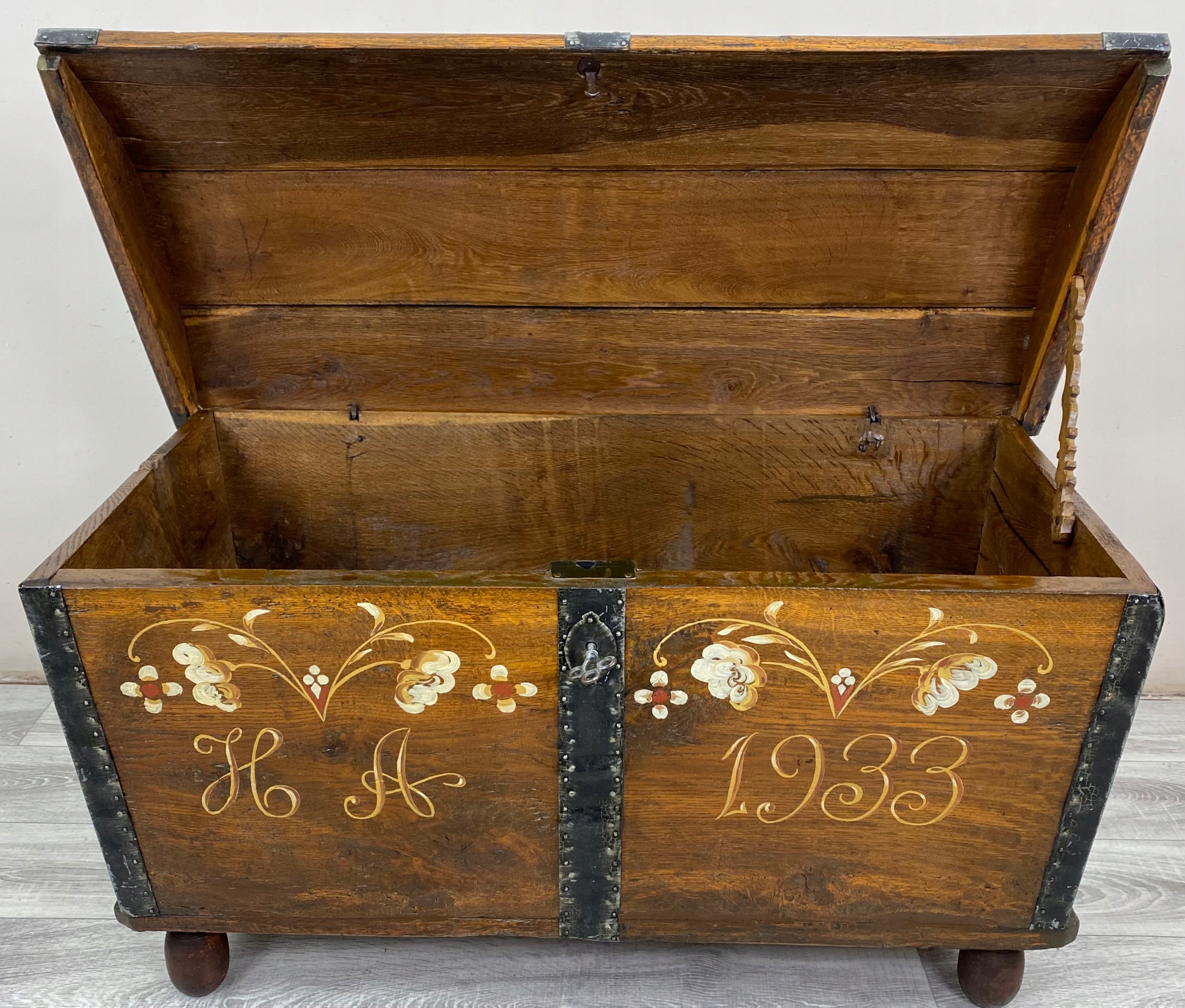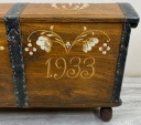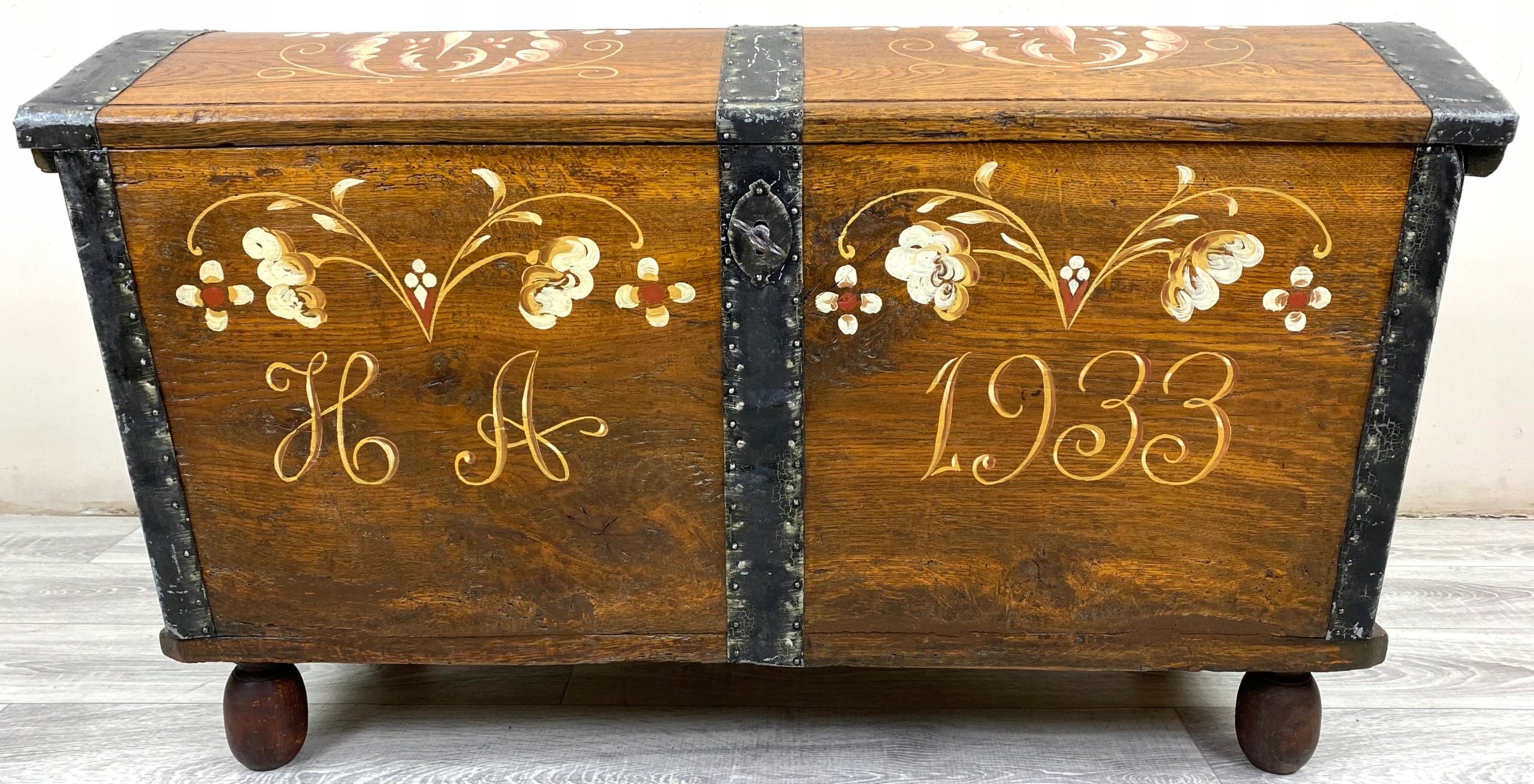 To piękna, ręcznie malowana skrzynia o bardzo rustykalnym charakterze. Wykonana jest z litego drewna dębowego, a jej boki są delikatnie rozszerzane ku górze, co nadaje jej lekko tradycyjny, ludowy kształt.Skrzynia stoi na okrągłych, drewnianych nóżkach, które nadają jej nieco lżejszy wygląd mimo masywnej konstrukcji. Całość wygląda jak tradycyjna skrzynia posagowa lub kuferek regionalny – możliwe, że pochodzi z terenów Europy Środkowej lub Skandynawii, gdzie takie malowane meble były popularne.