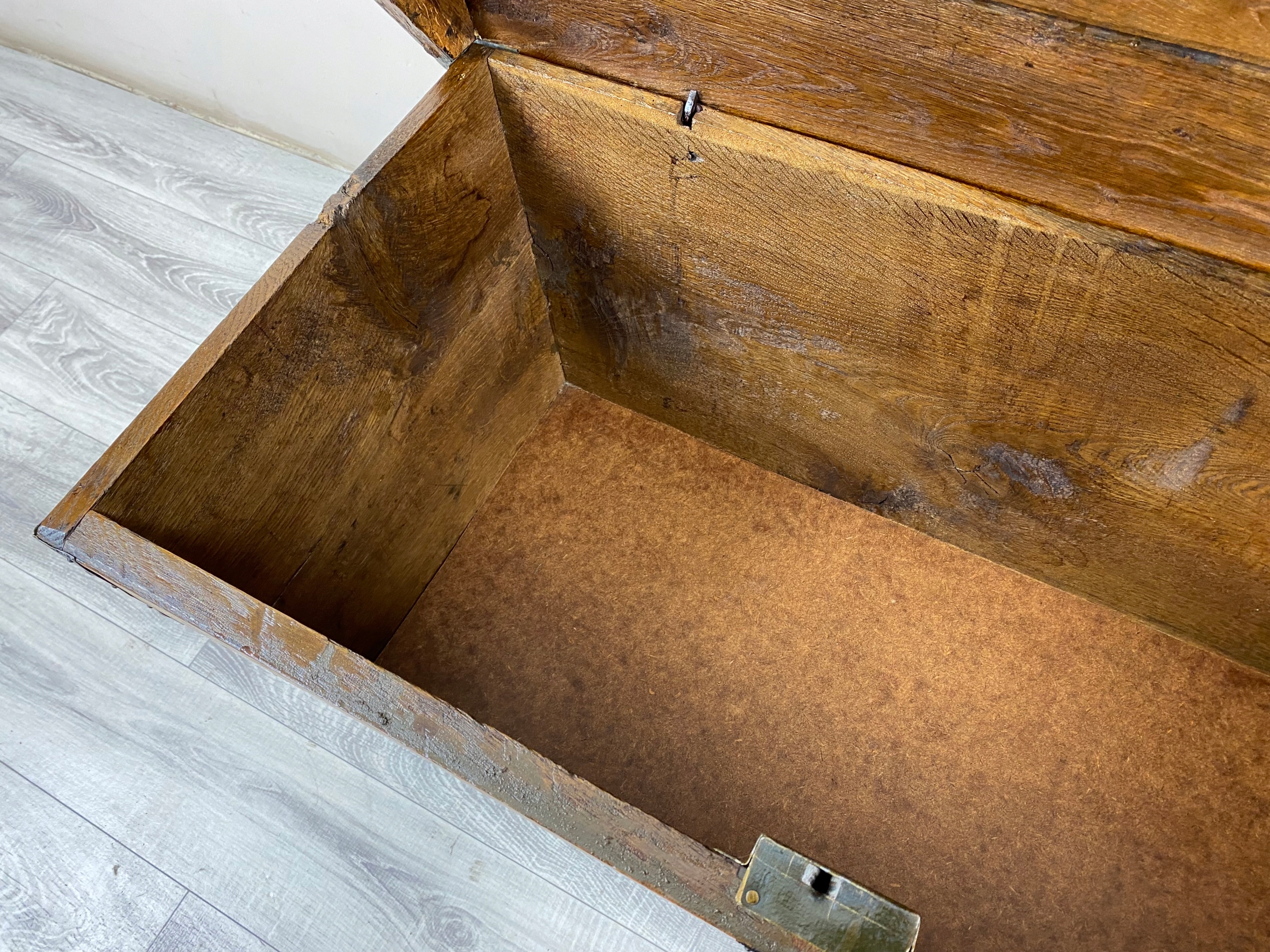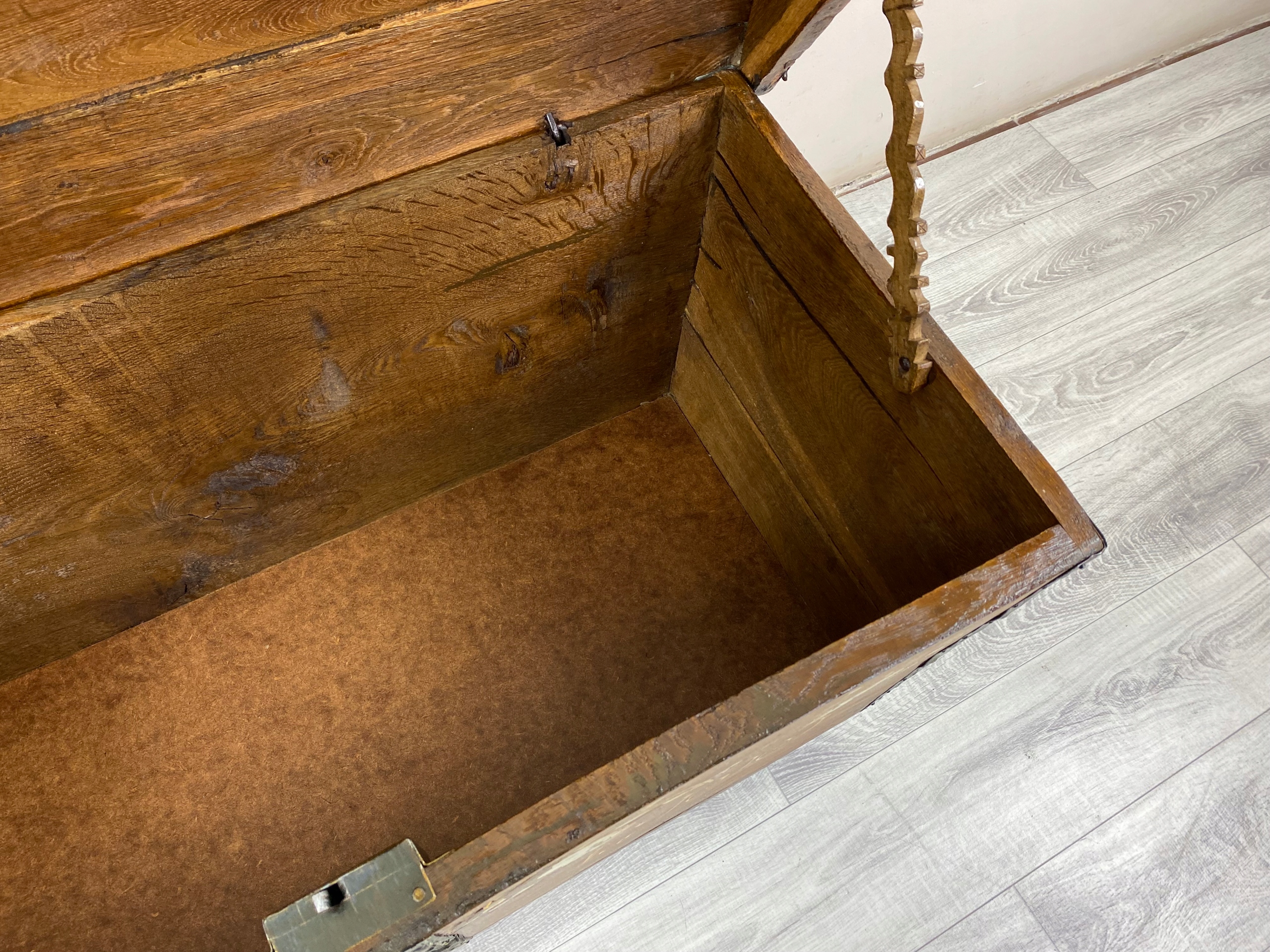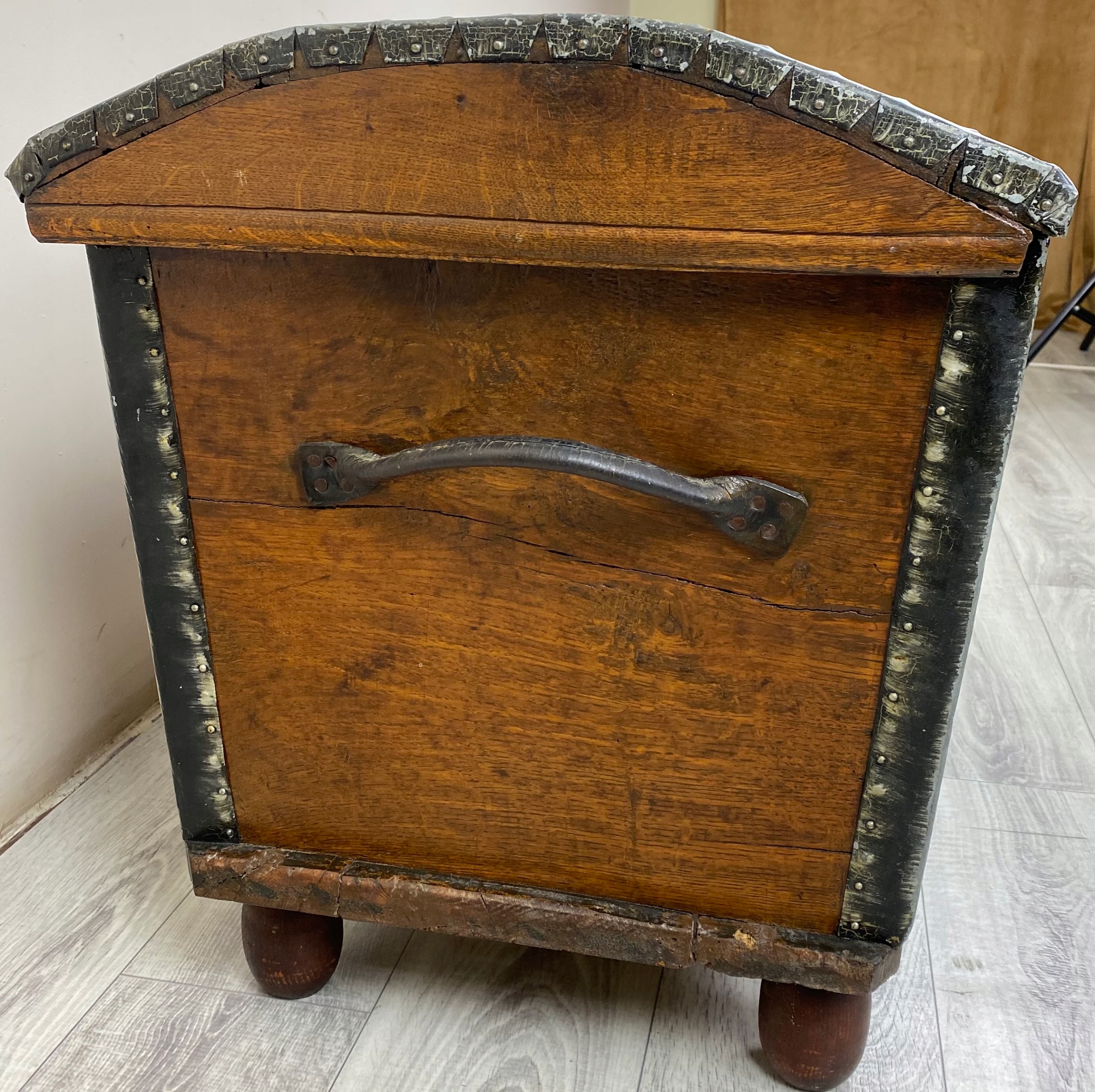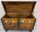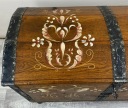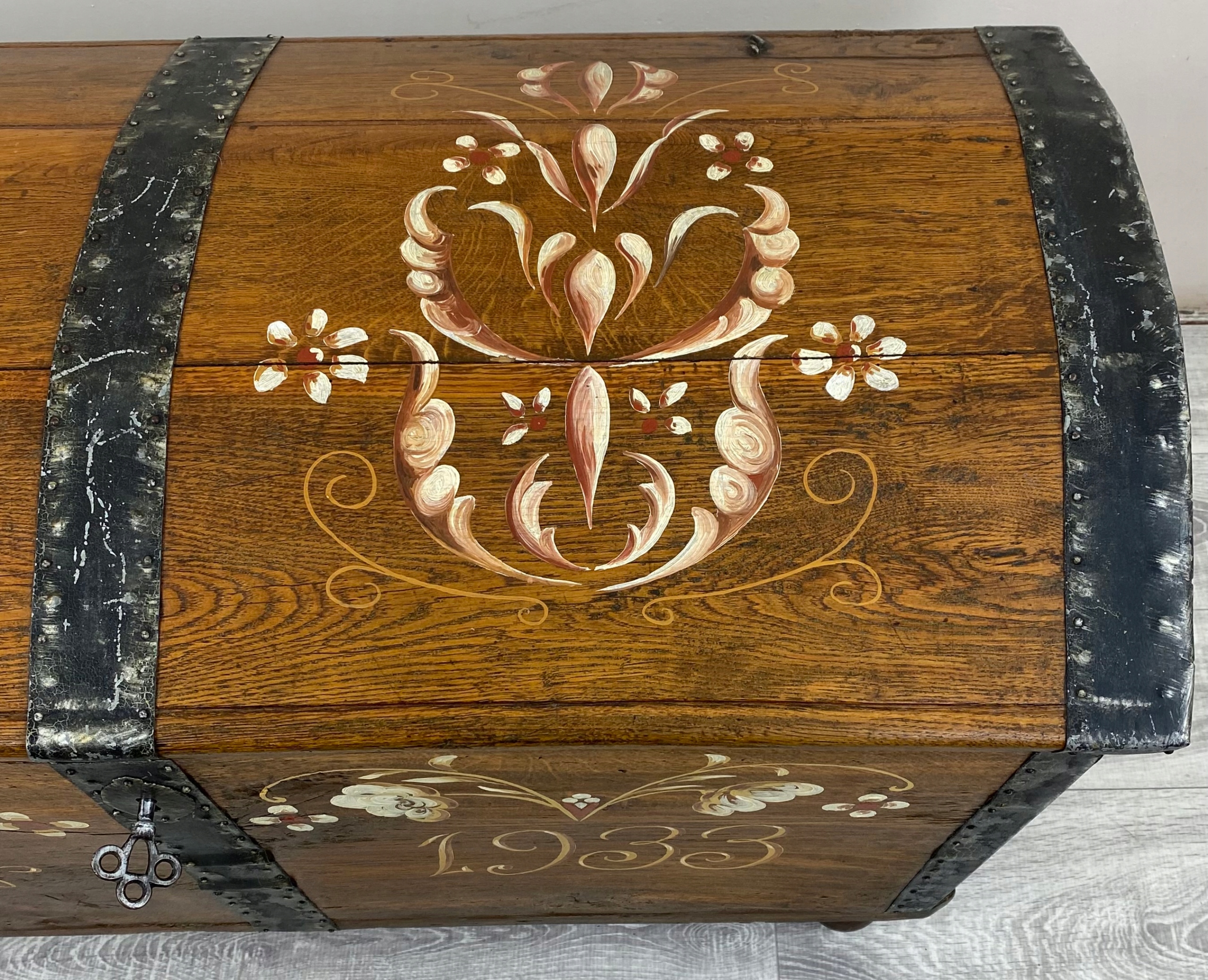 To piękna, ręcznie malowana skrzynia o bardzo rustykalnym charakterze. Wykonana jest z litego drewna dębowego, a jej boki są delikatnie rozszerzane ku górze, co nadaje jej lekko tradycyjny, ludowy kształt.Skrzynia stoi na okrągłych, drewnianych nóżkach, które nadają jej nieco lżejszy wygląd mimo masywnej konstrukcji. Całość wygląda jak tradycyjna skrzynia posagowa lub kuferek regionalny – możliwe, że pochodzi z terenów Europy Środkowej lub Skandynawii, gdzie takie malowane meble były popularne.