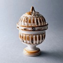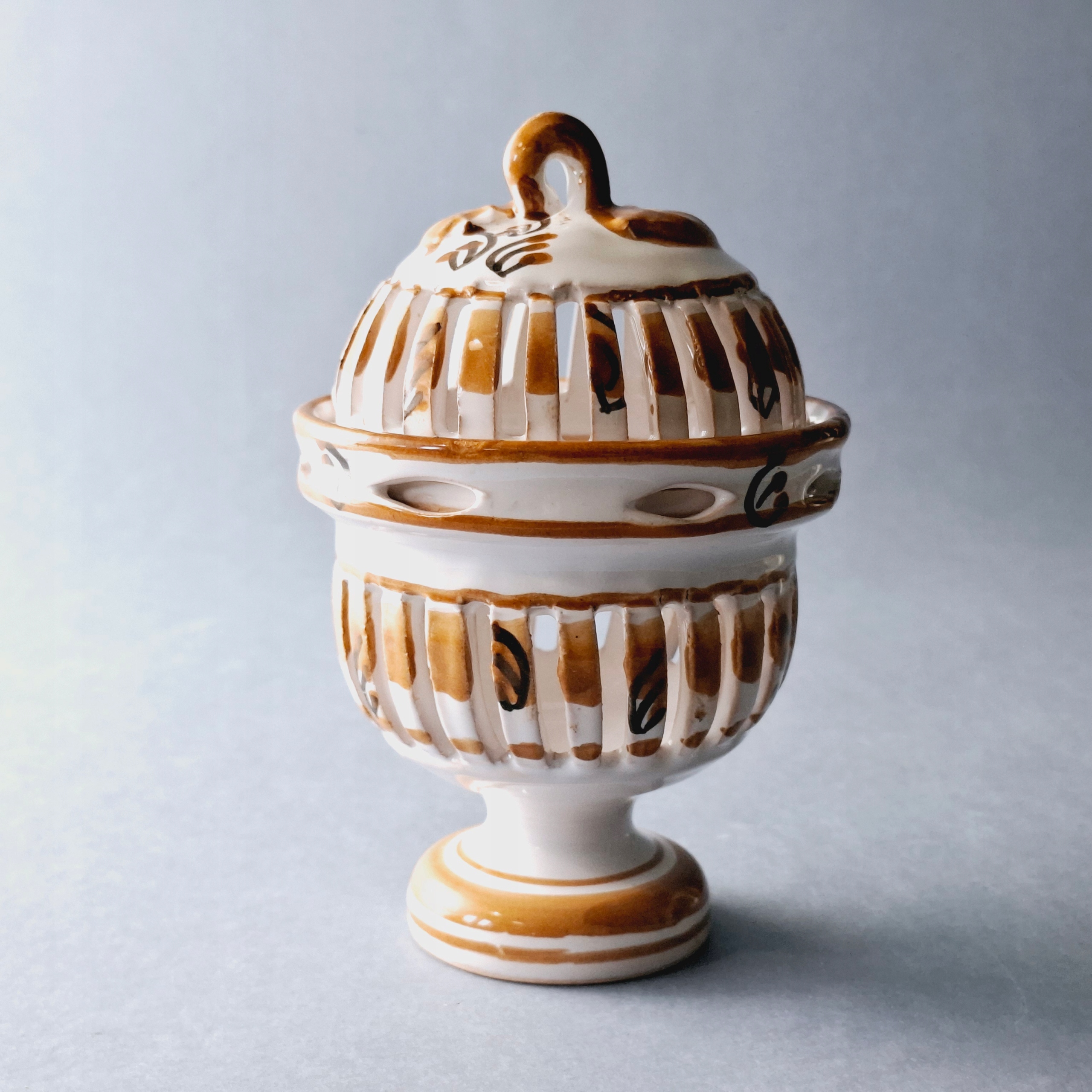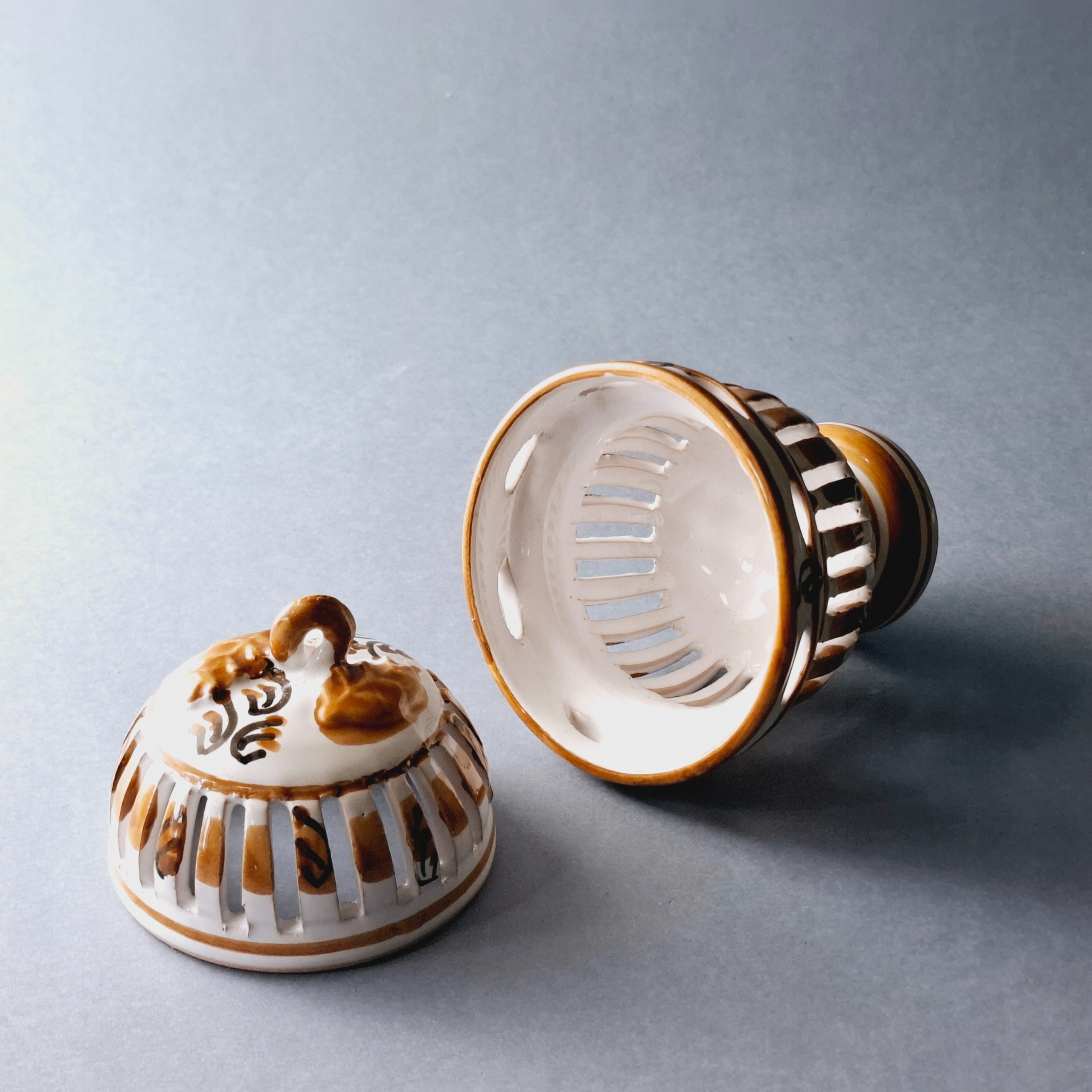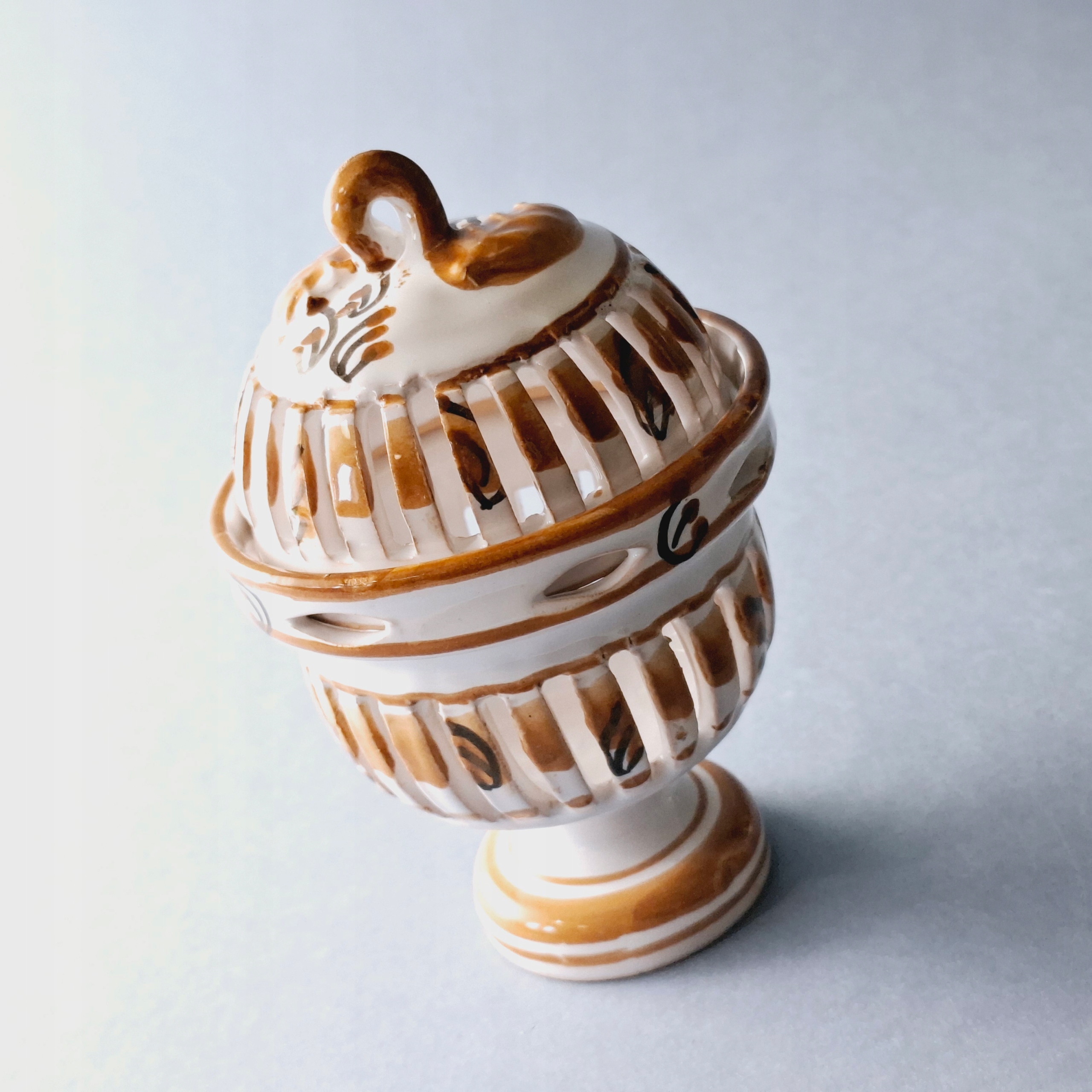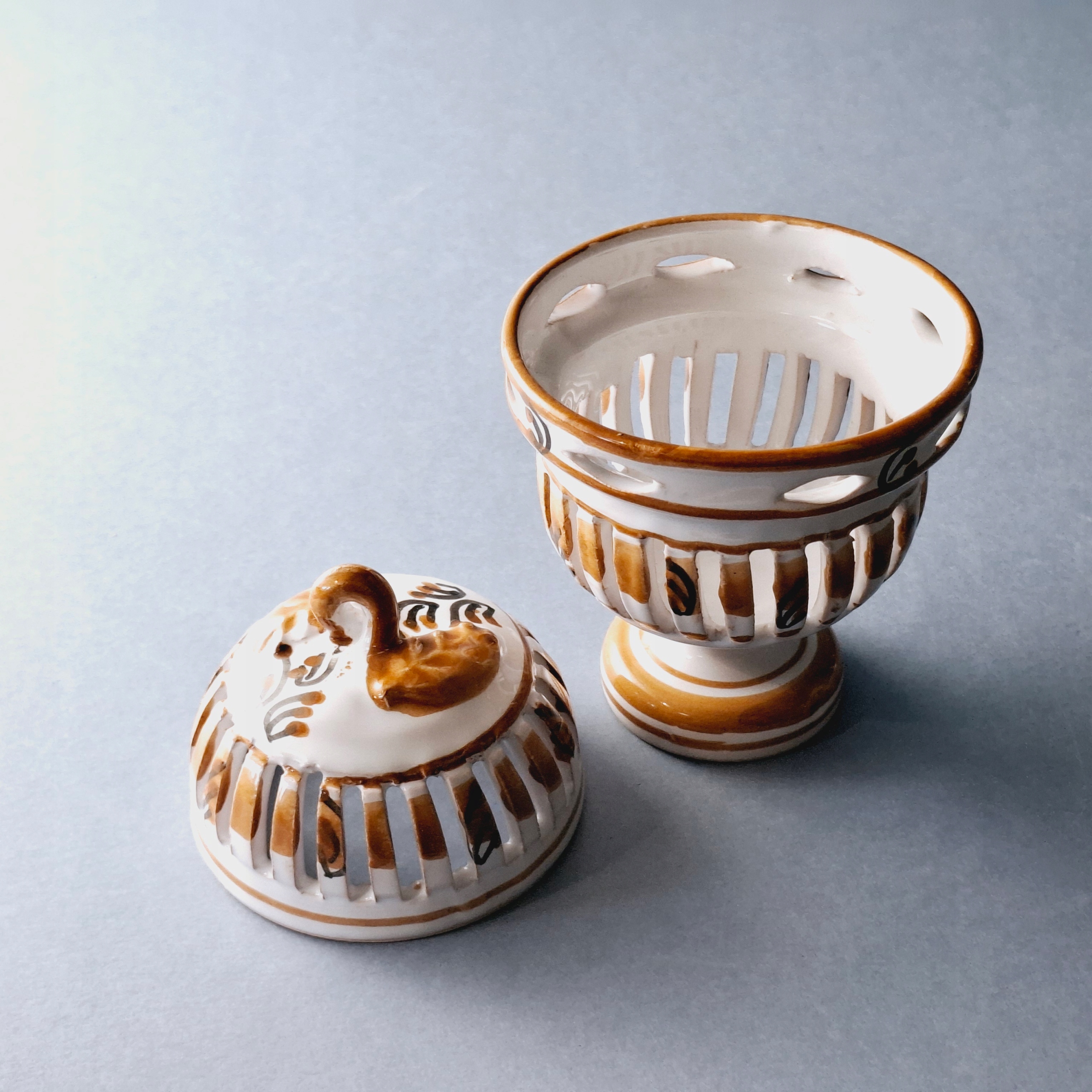 Bardzo ładny, ręcznie wykonany, ażurowy pojemnik ze szkliwionej ceramiki.