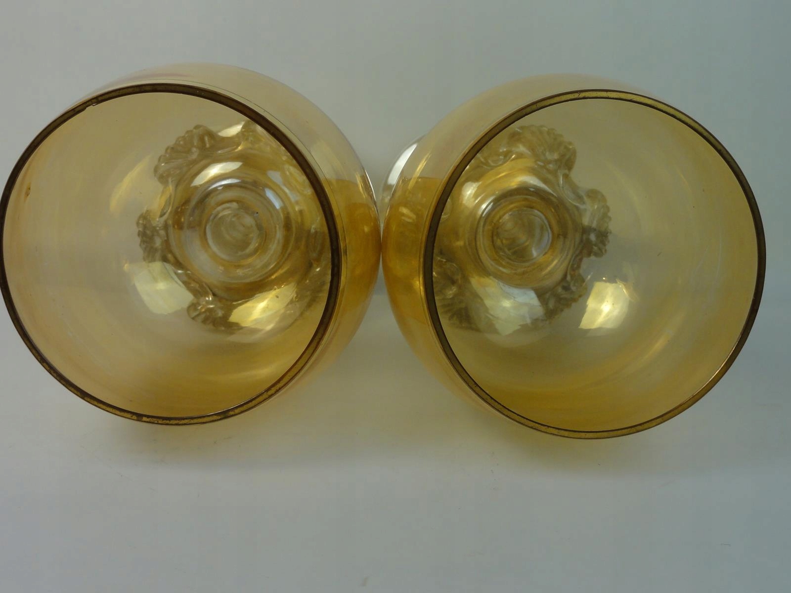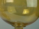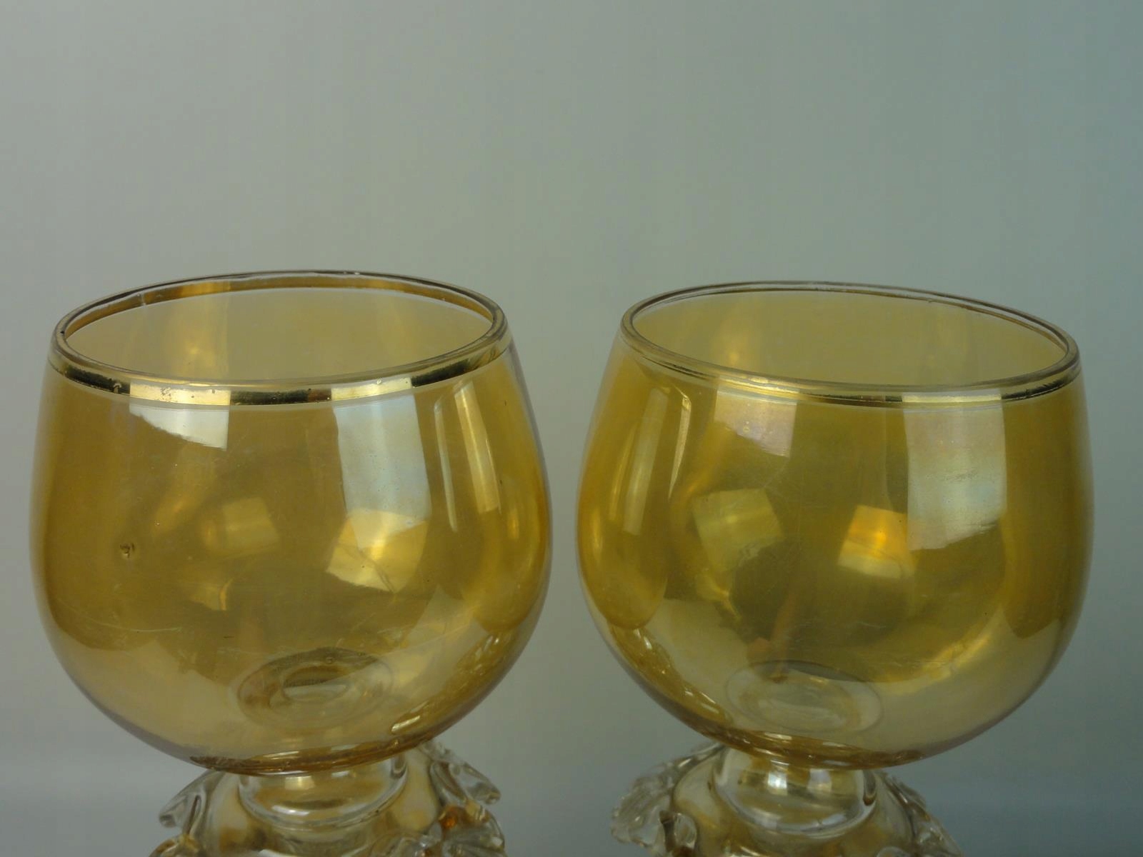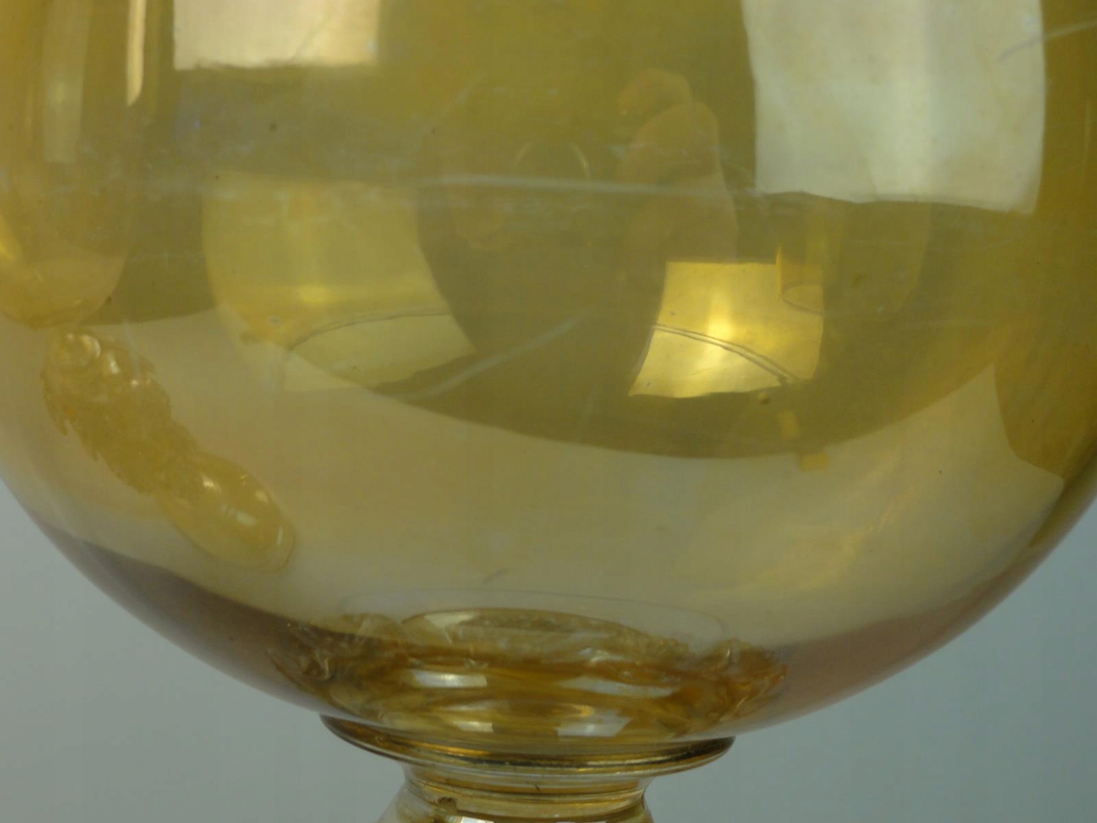 *kielich wykonany ze szkła z iryzacją lustrową w kolorze bursztynowym, trzon bogato zdobiony, wewnątrz pusty,