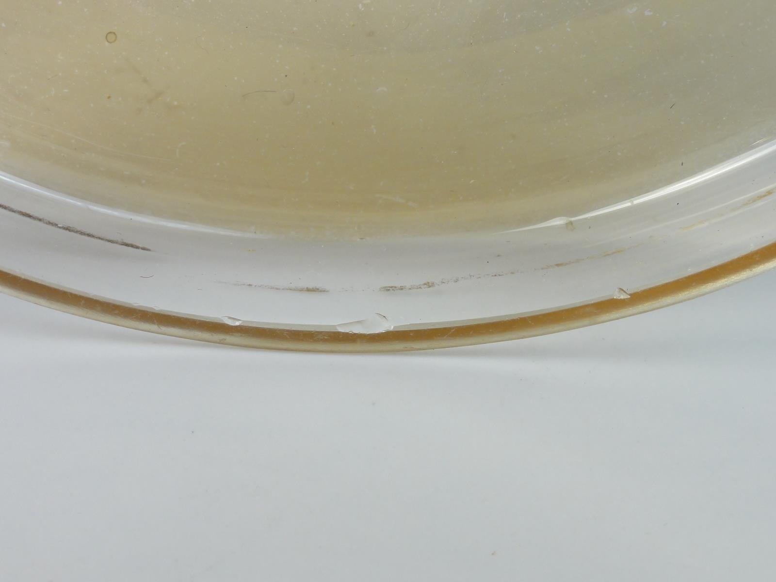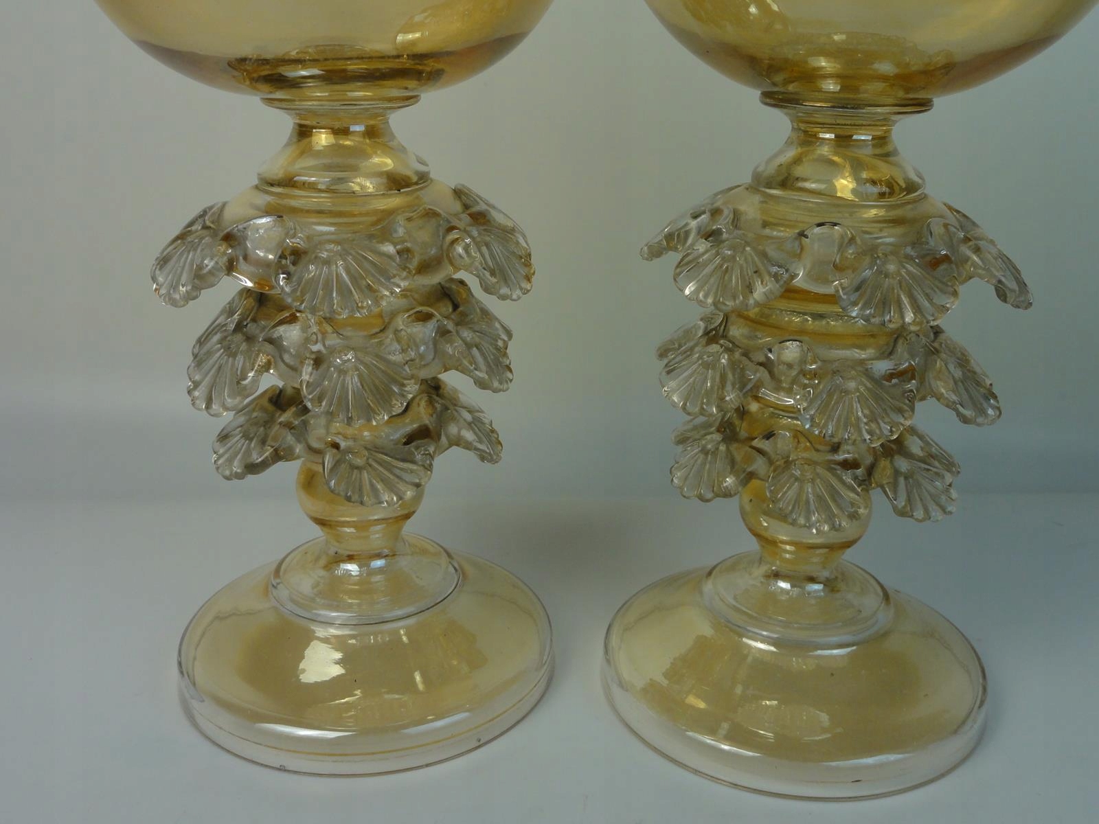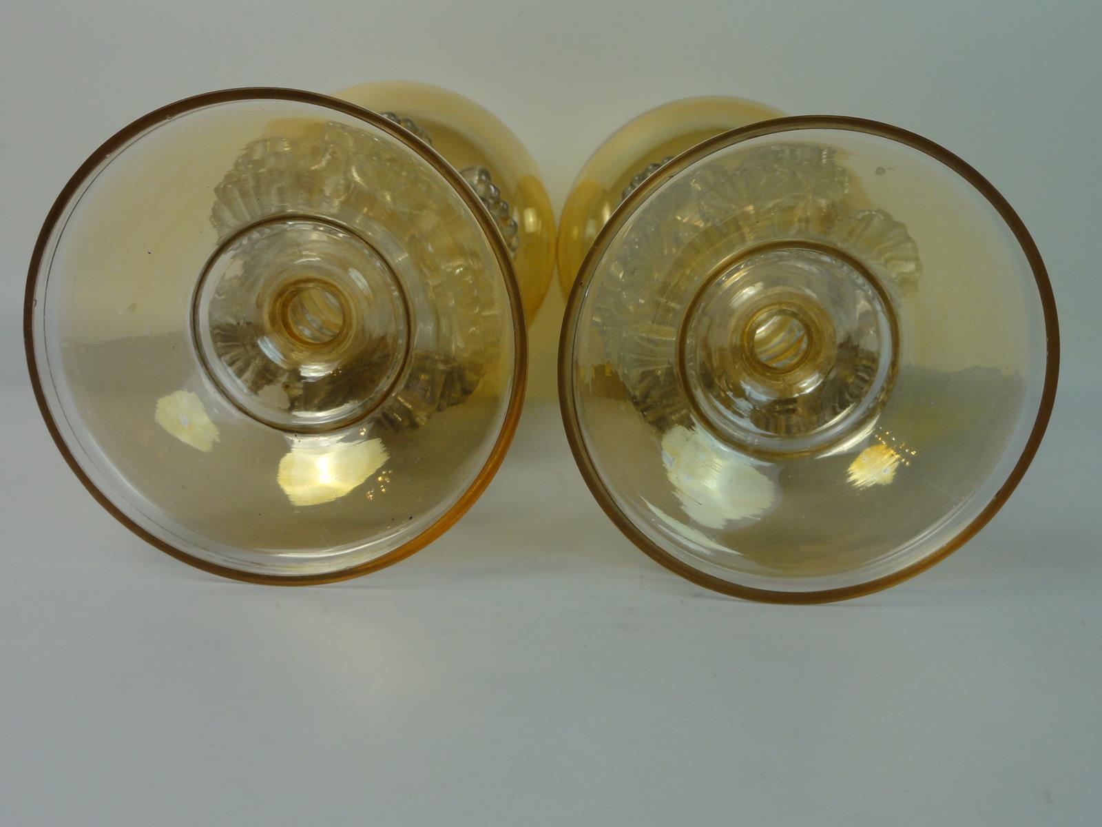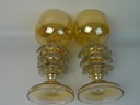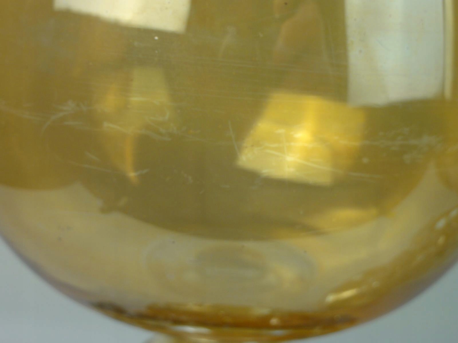 *kielich wykonany ze szkła z iryzacją lustrową w kolorze bursztynowym, trzon bogato zdobiony, wewnątrz pusty,