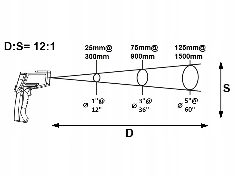 Dla prezentowanego pirometru optyka wynosi 12:1, a więc plamka będzie 12 razy mniejsza niż odległość od obiektu.