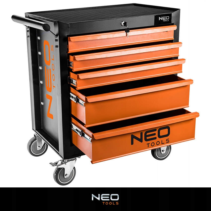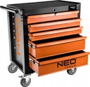 Szafka narzędziowa NEO o wymiarach 680 × 460 × 825 mm. Szafka posiada 5 praktycznych szuflad na narzędzia, zamykanych za pomocą zamka centralnego. Wszystkie szuflady są w pełni otwierane, posiadają prowadnice kulkowe, zapewniające długoletnie, płynne i niezawodne działanie. Szuflady zabespieczone są blokadą zapadkową, która zapewnia ochronę otoczenia w czasie transportu. Powierzchnia blatu roboczego pokryta jest gumową wykładziną, odporną na działanie oleju i smarów. Pięciocalowe, ciche, skrętne koła ułatwiają manewrowanie szafką dodatkowo wyposażone są w hamulec. Nośność szafki 280 kg. Szafka wyposażona jest w uchwyt, który ułatwia prowadzenie. .. Marka NEO spełnia oczekiwania profesjonalistów.