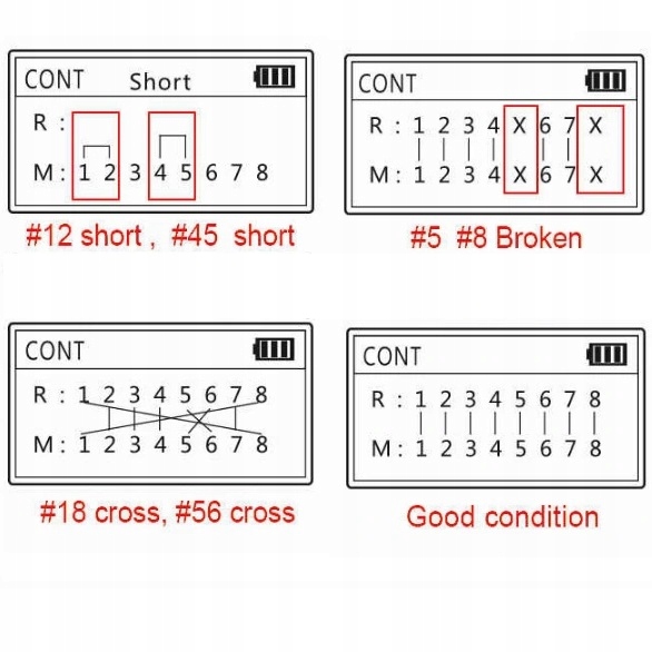 - Wykrywane uszkodzenia błędnych połączeń, zwarć i przerw w okablowaniu