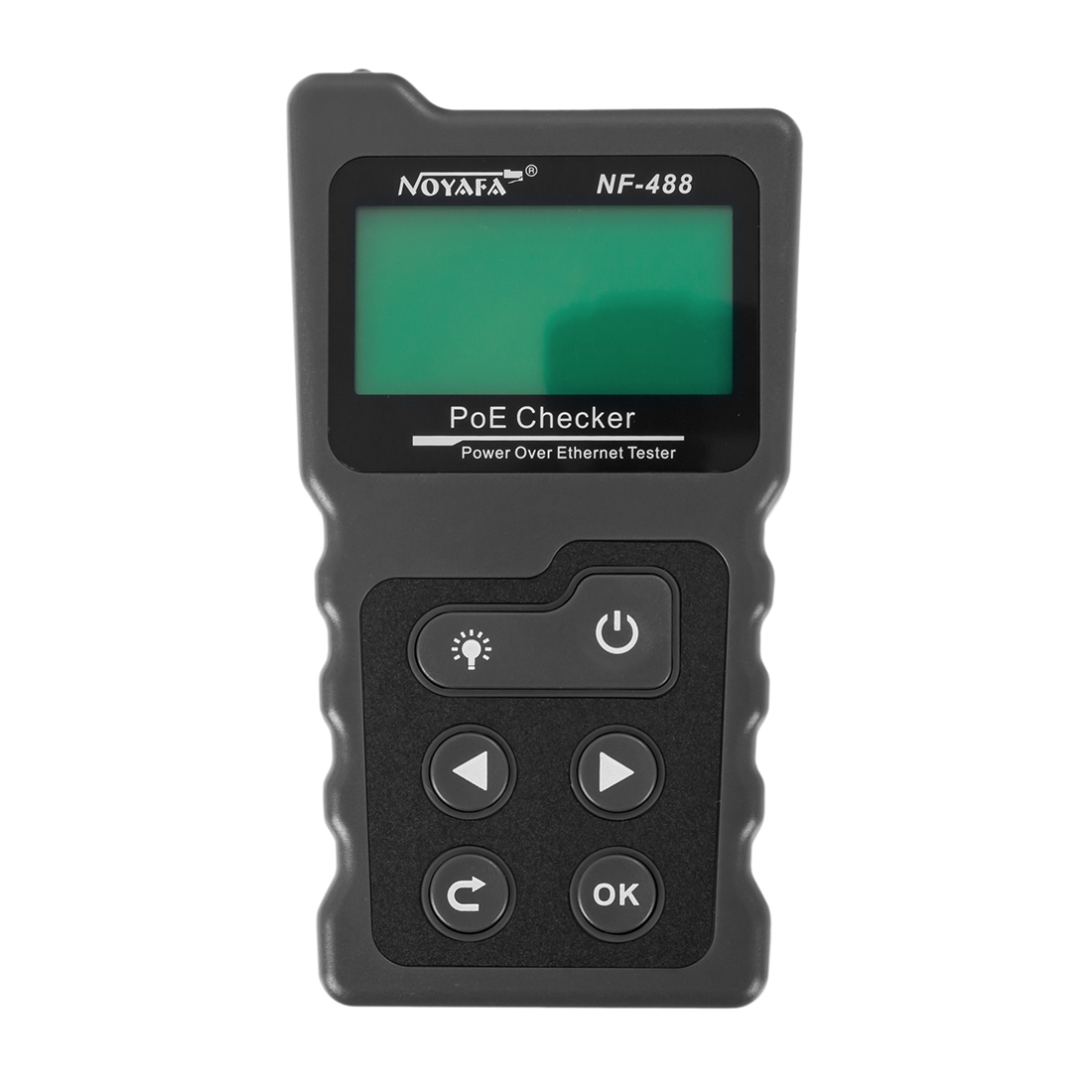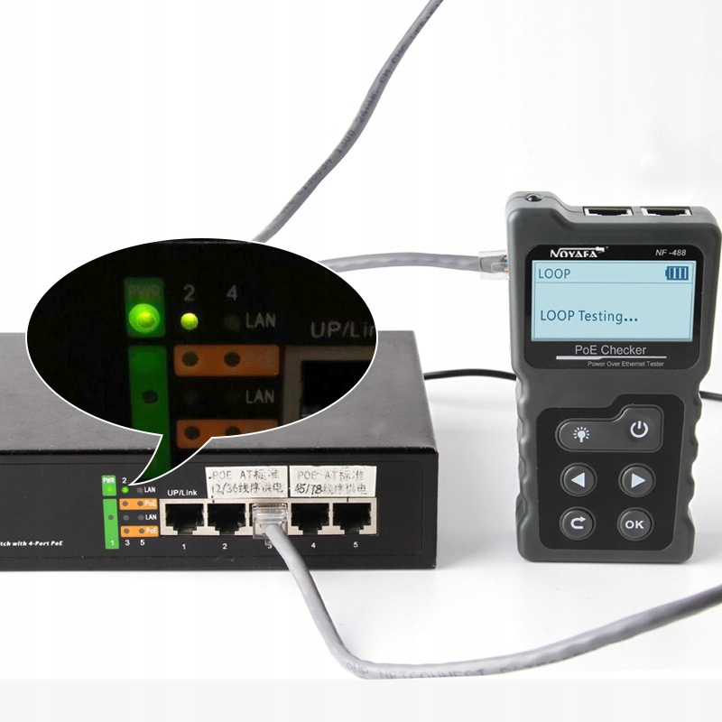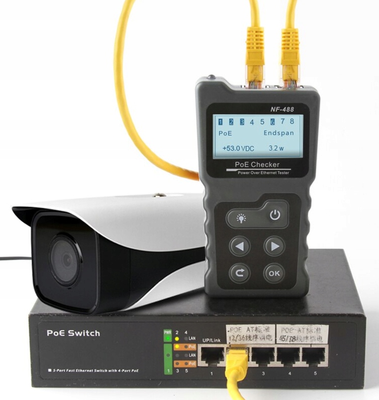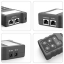 Zaawansowany tester okablowania sieciowego z wyświetlaczem LED. Pozwala na weryfikację poprawności połączenia kabli sieciowych zasilanych PoE. Urządzenie do testów instalacji z PoE. Urządzenie rozpoznaje na których liniach występuje napięcie, podaje jego wartość oraz określa standard PoE. Można je również włączyć szeregowo pomiędzy switch a zasilane urządzenie, dzięki czemu uzyskamy informację o poborze prądu i pobieranej przez odbiornik mocy, przeprowadza standardowy test mapy połączeń.