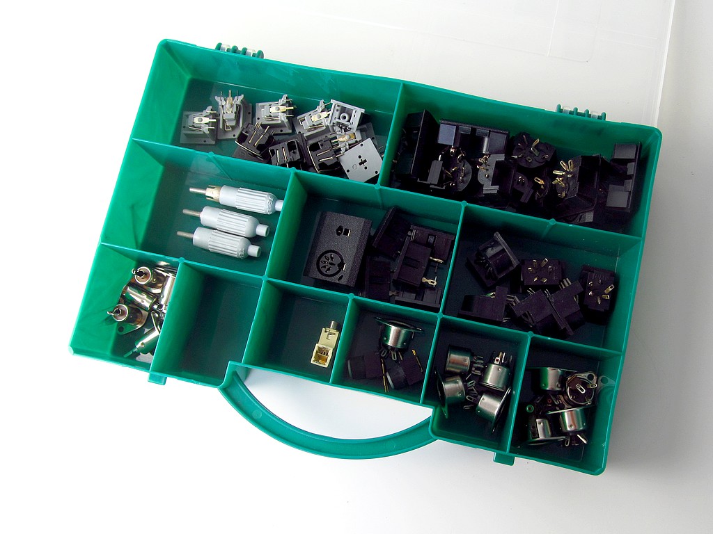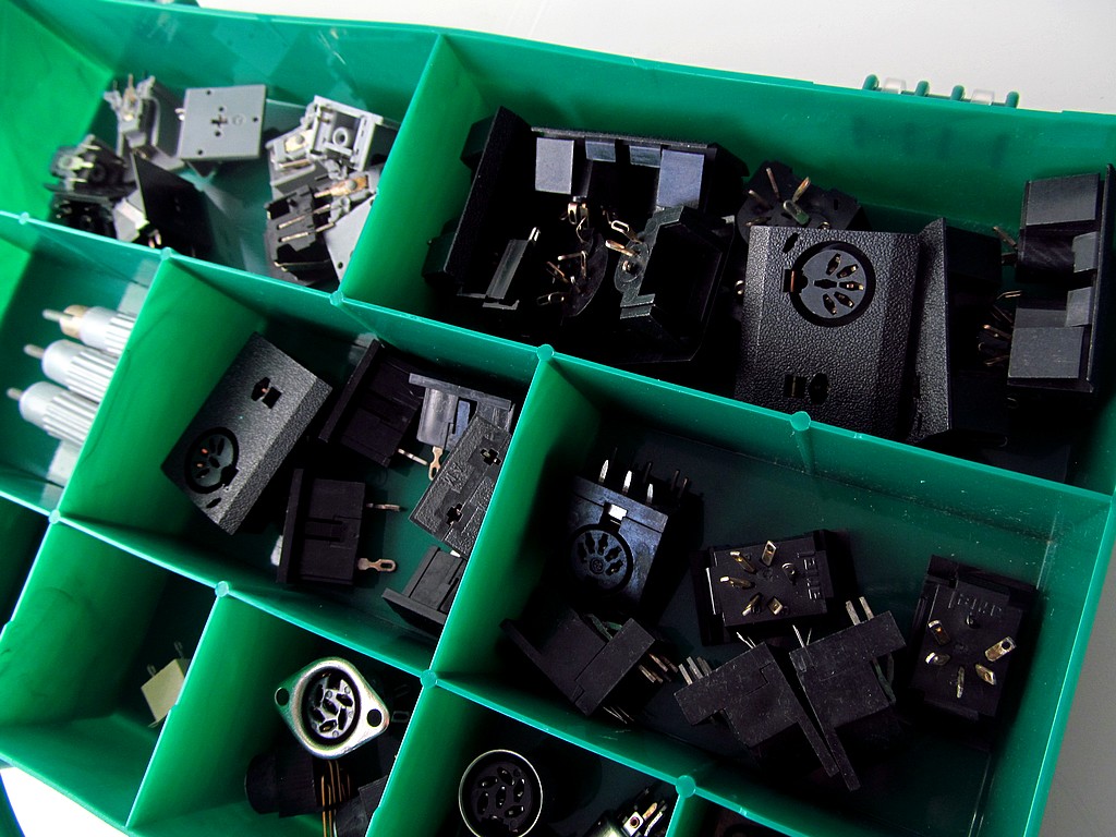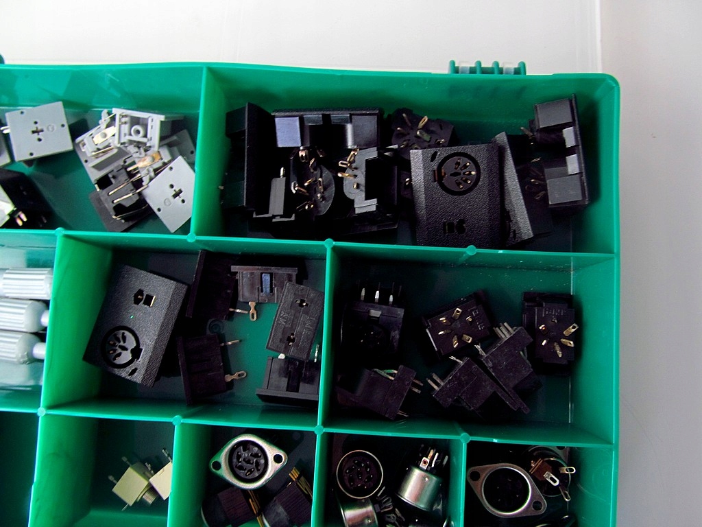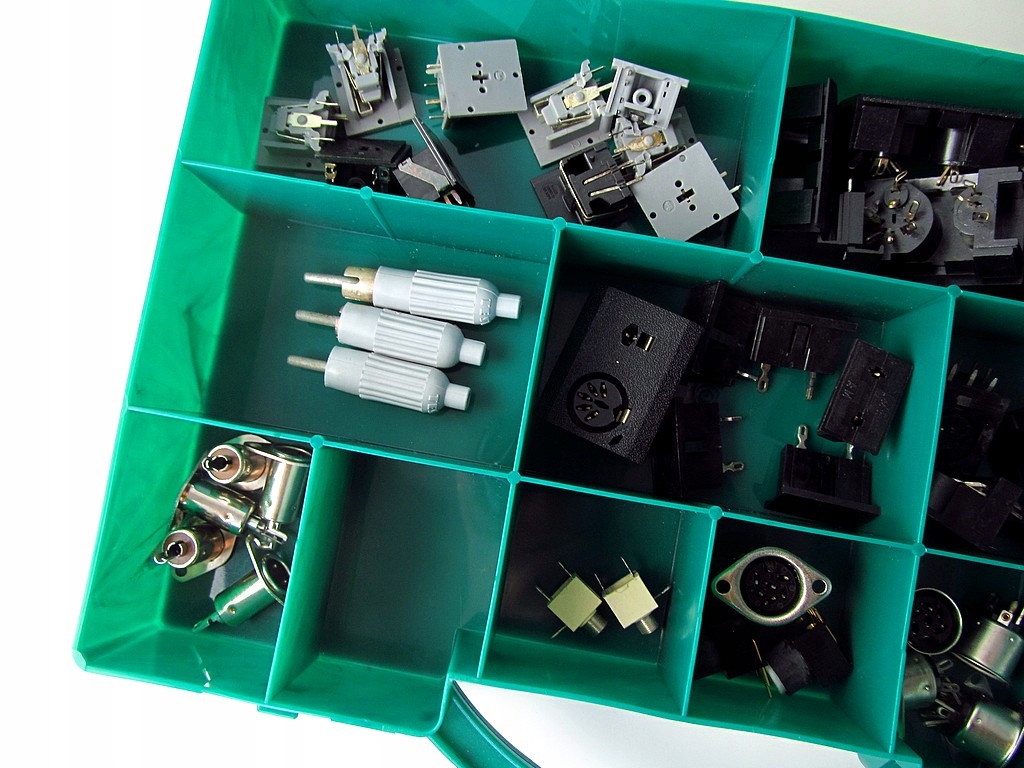 Komplet 50 starych gniazd audio wraz z pudełkiem.