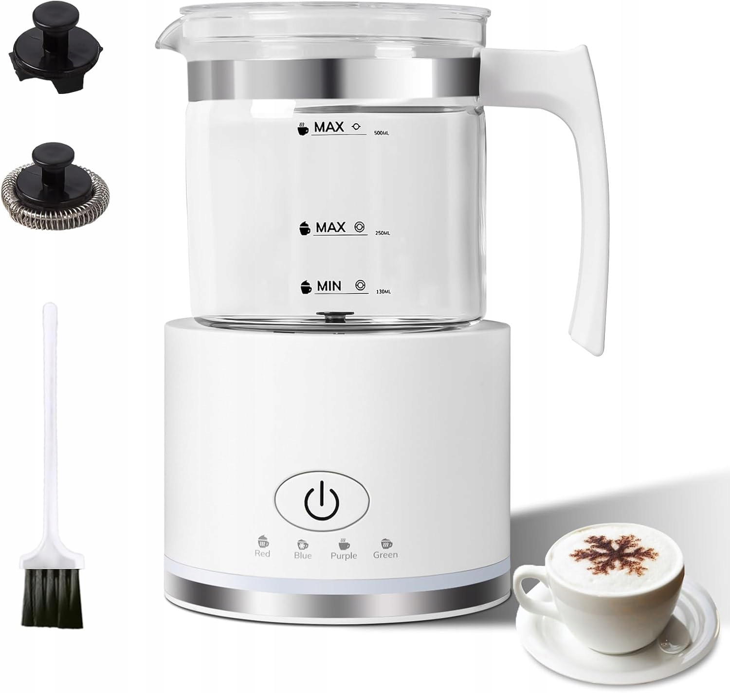 ✅Funkcja cztery w jednym: Ten automatyczny spieniacz do mleka oferuje cztery funkcje za jednym dotknięciem. Kolorowe lampki kontrolne na podstawie ułatwiają wybór żądanego programu – czerwony dla ciepłej, gęstej pianki, niebieski dla zimnej pianki, fioletowy dla gorącego mleka i zielony dla ciepłej, puszystej pianki. Można go używać do przygotowywania cappuccino, macchiato, latte i innych napojów.