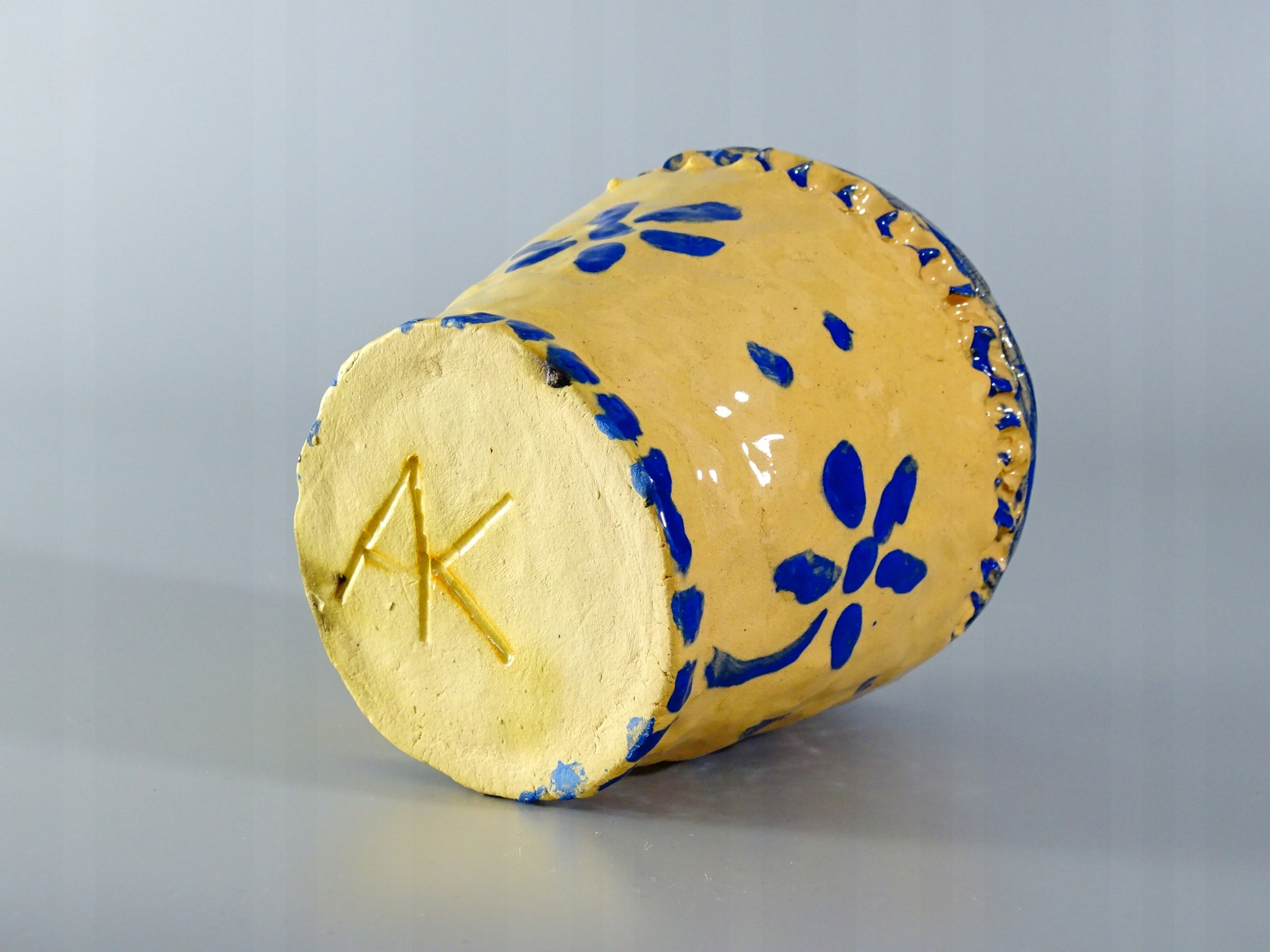 10 cm średnicy i 9 cm wysokości, bardzo ładny stan zachowania, na spodzie sygnatura autora.