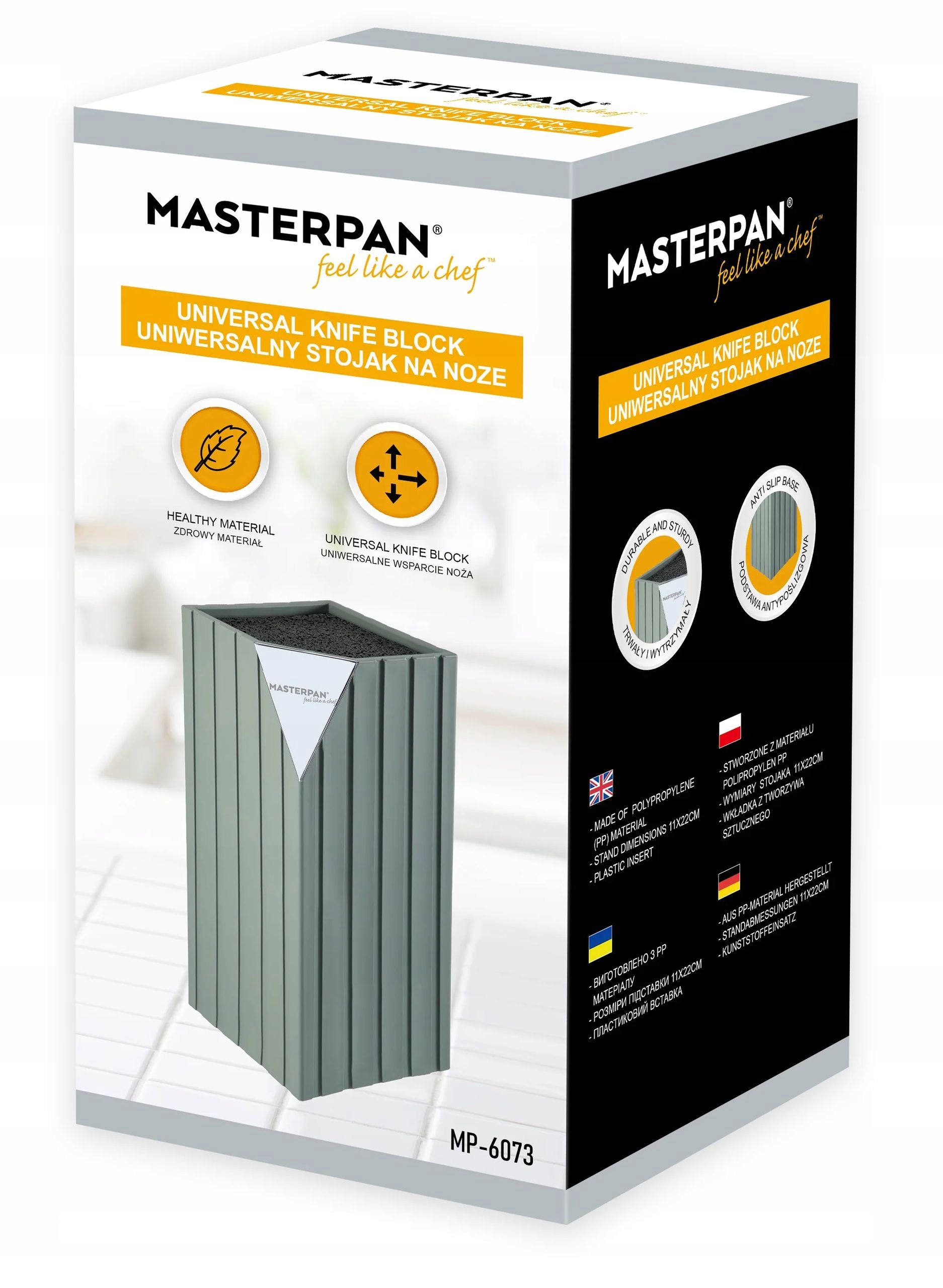 Stojak na noże jest zapakowany w kolorowe pudełko, idealne na prezent.