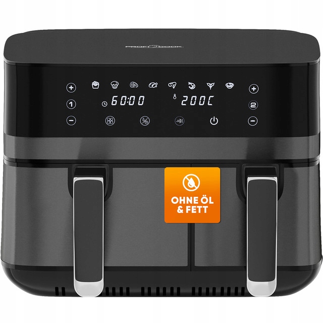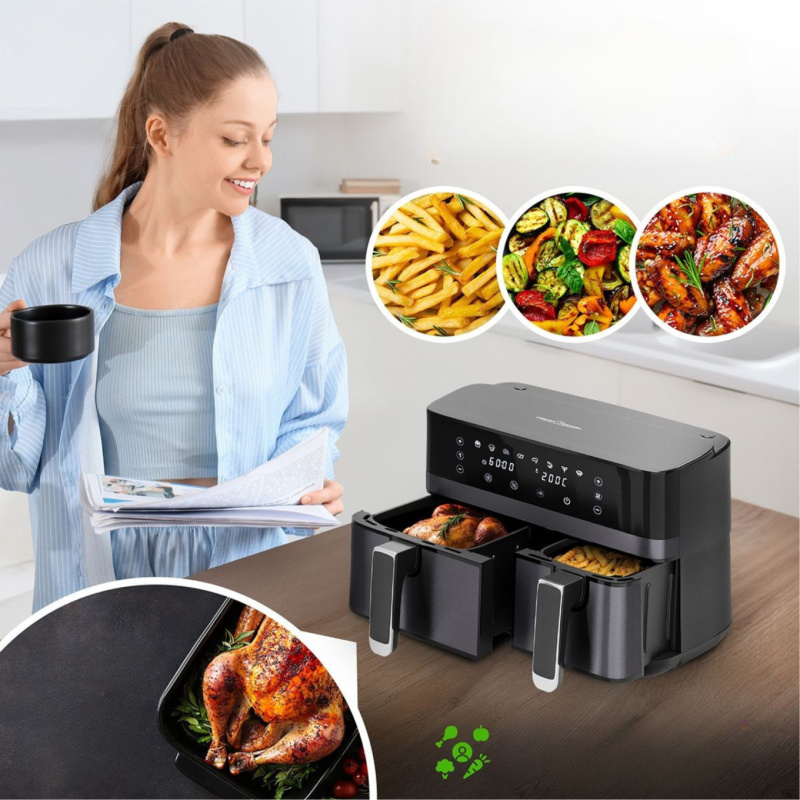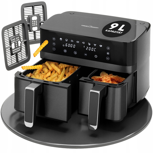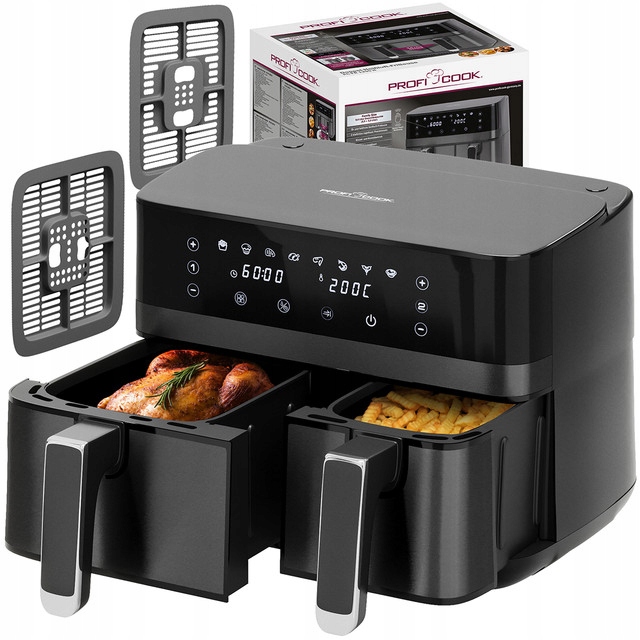 ProfiCook PC-FR 1295 H to duża, beztłuszczowa frytownica powietrzna z dwoma, asymetrycznymi pojemnikami o pojemności 5.5 i 3.5 litra. Łączna pojemność robocza to aż 9 litrów! Jest to połączenie pieca konwekcyjnego, grilla i frytkownicy i umożliwia smażenie potraw bez użycia tłuszczu. Przygotowywanie potraw odbywa się przy pomocy cyrkulacji gorącego powietrza - potrawy są zdrowsze, mają mniej kalorii a poziom tłuszczu spada nawet o 95%. Urządzenie ma szerokie zastosowanie, dzięki niemu możemy piec, grillować, smażyć, podgrzewać, rozmrażać oraz opiekać. Dzięki frytkownicy przygotujemy między innymi frytki, mięso, ryby, warzywa a nawet ciastka.