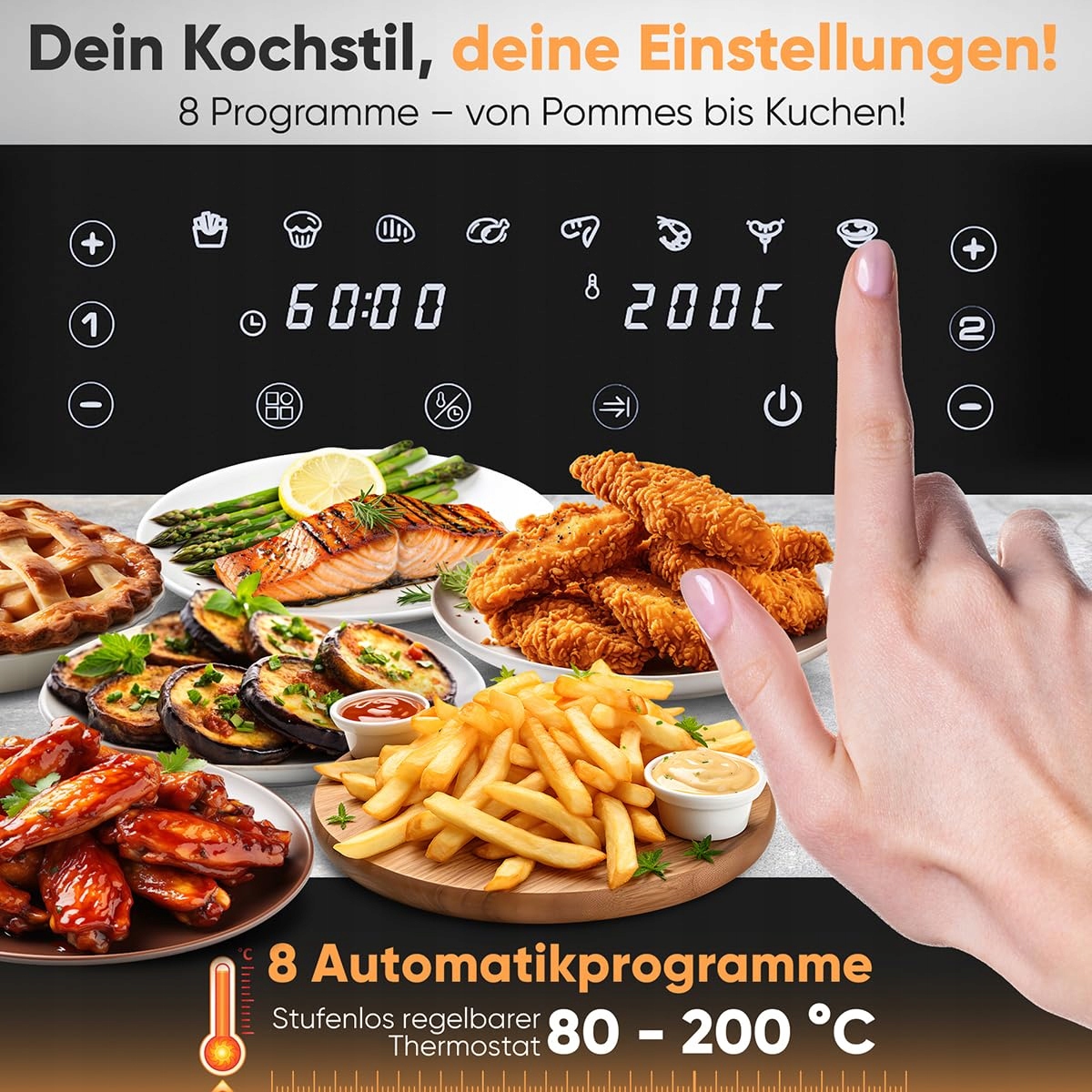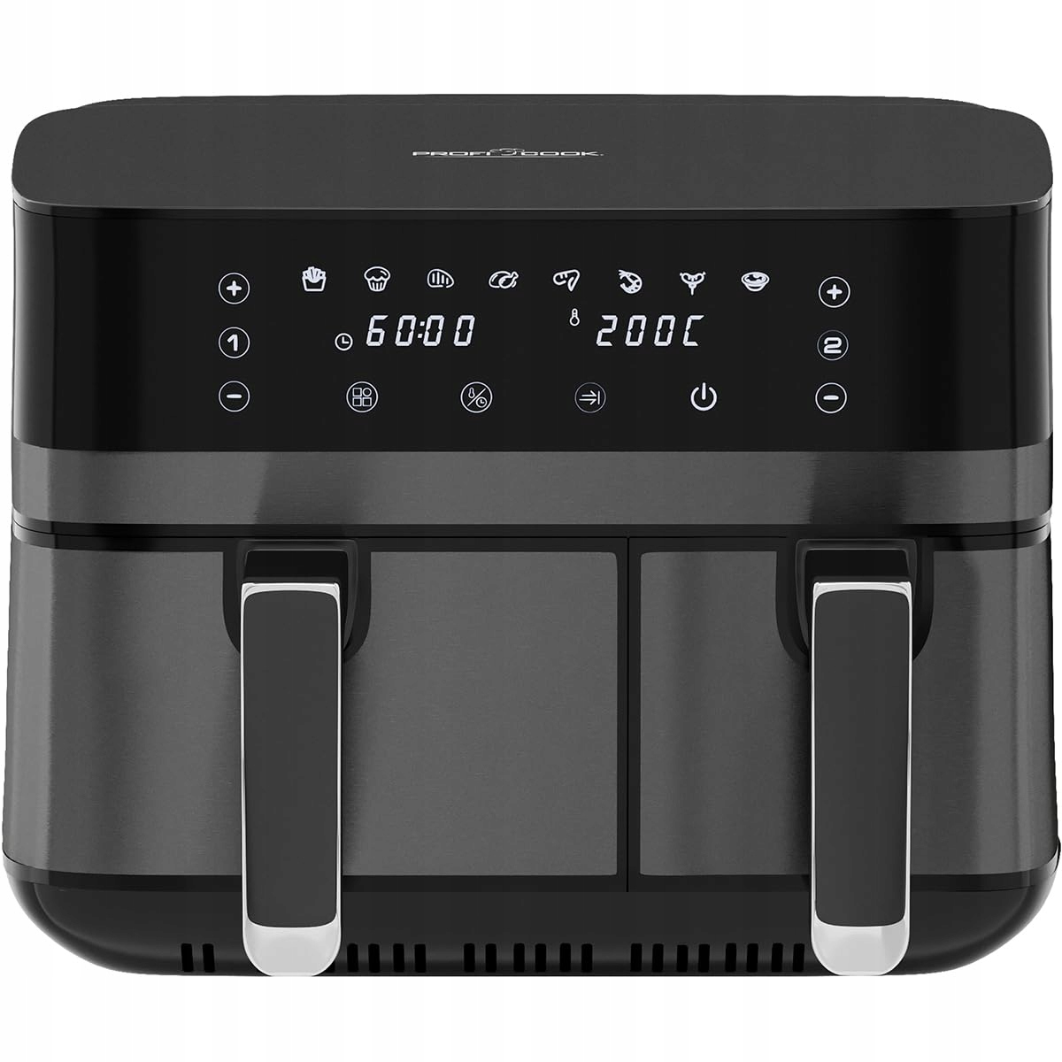 Dwa dotykowe panele LED dają możliwość wyboru jednego z ośmiu zdefiniowanych programów zawierających indywidualne ustawienia temperatury i czasu dla najpopularniejszych dań. Timer pozwala dobrać odpowiedni czas przygotowywania potraw.