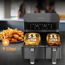 Urządzenie oferuje aż 9 litrów pojemności roboczej! Dzięki dwóm asymetrycznym koszom o pojemności 5.5 i 3.5 litra, możemy przygotować dwie osobne potrawy w dwóch różnych temperaturach.