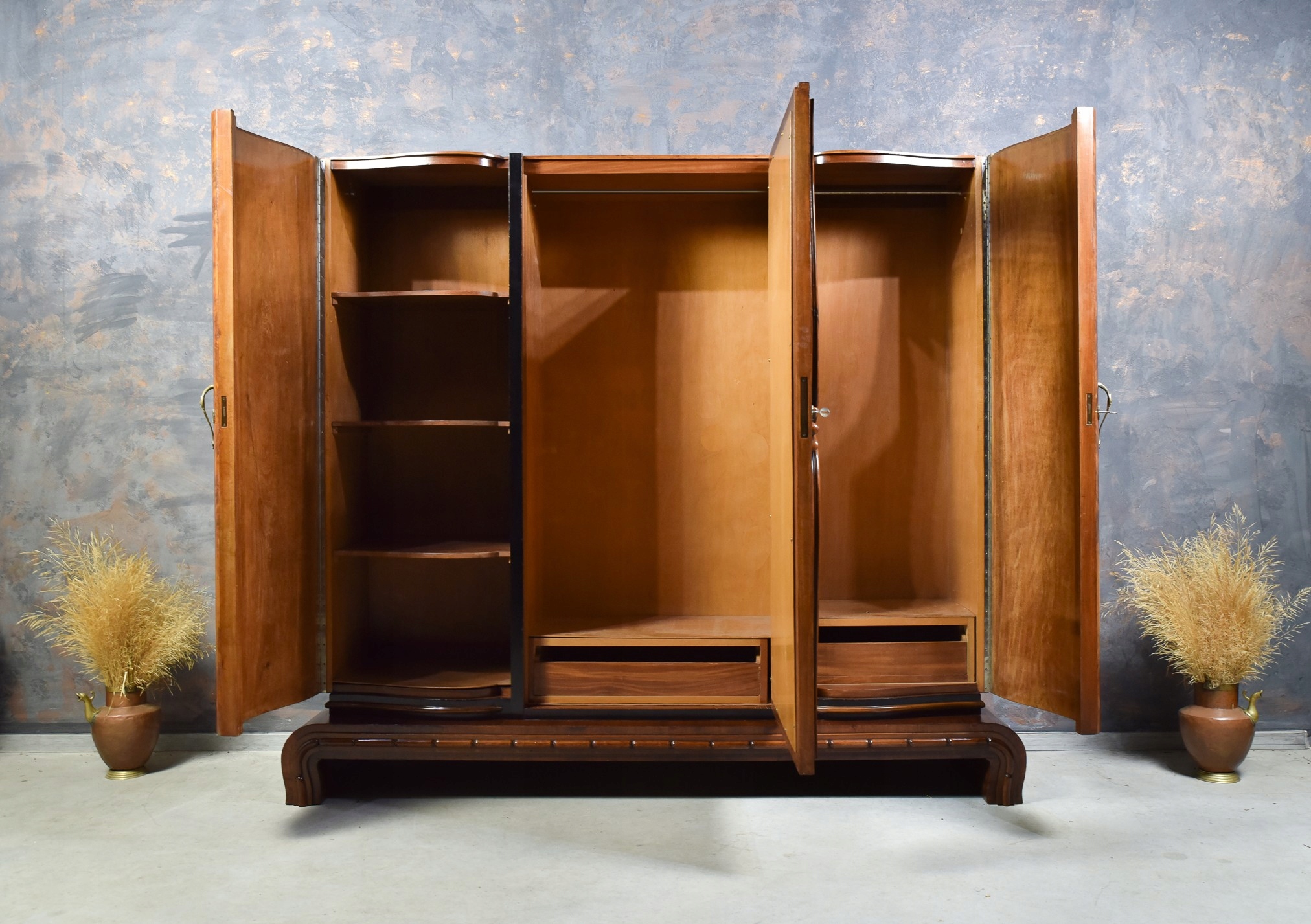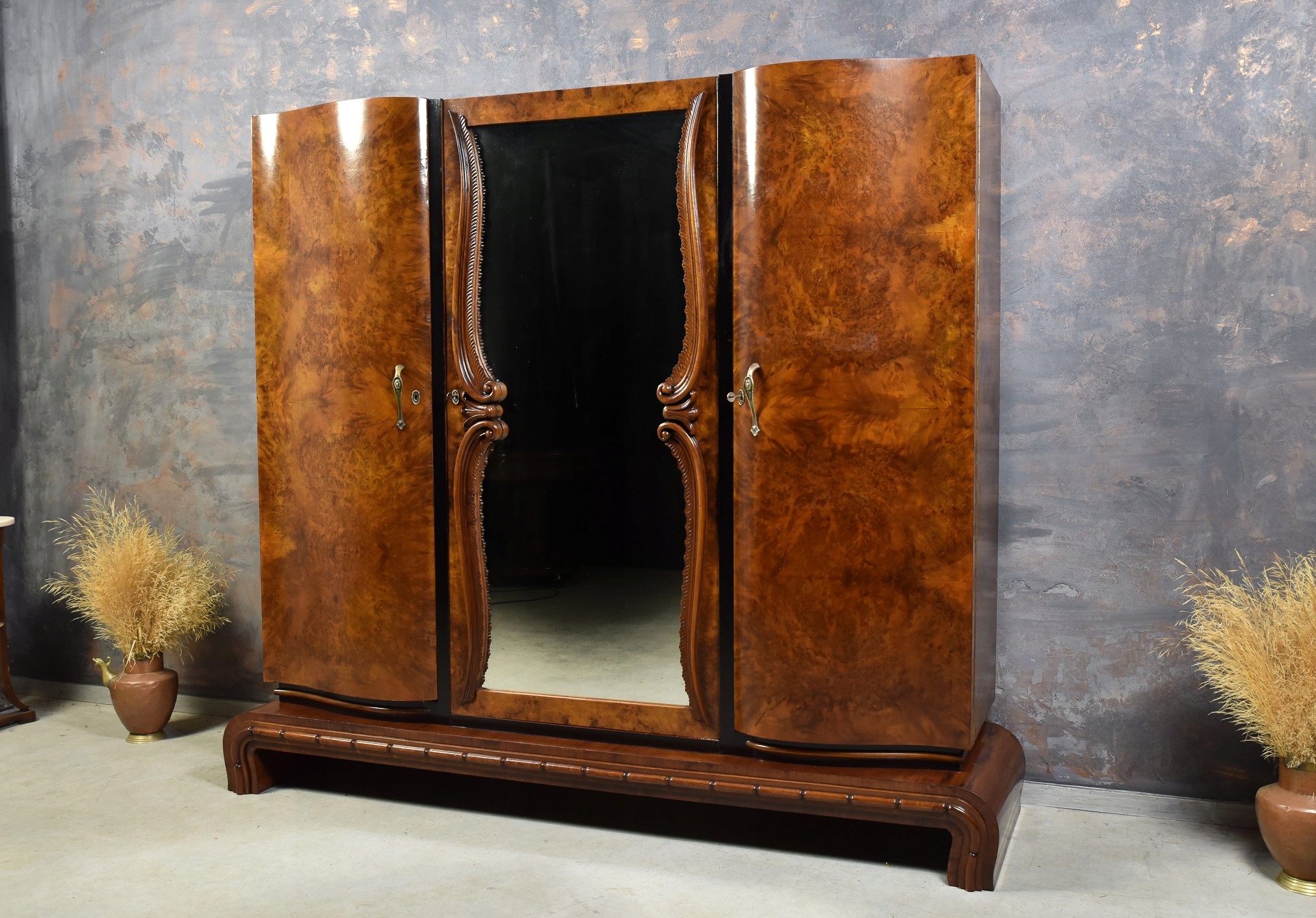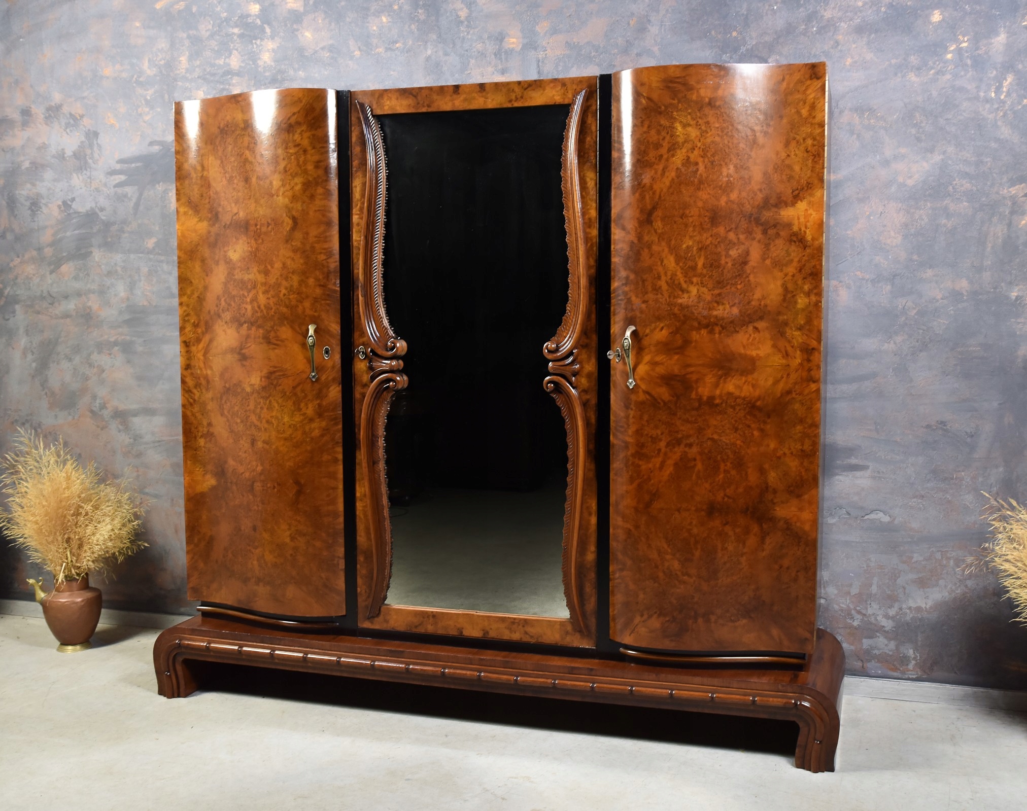 Prezentujemy elegancką, trzydrzwiową szafę wykonaną z drewna orzechowego w stylu Art Deco. Mebel powstał w około 1930.