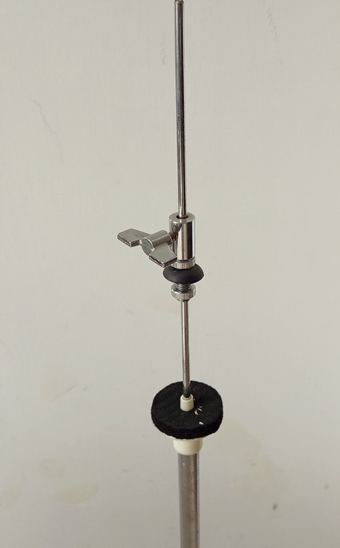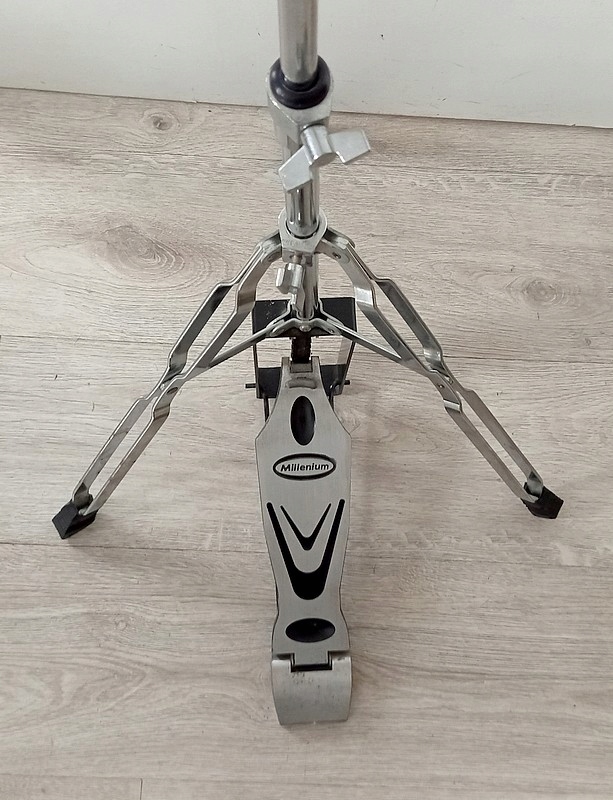 Masywny statyw hihat Millenium pokazany na zdjęciach.