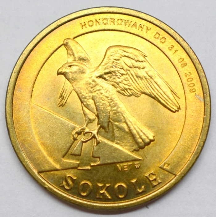 Rewers: W poziomie nominał pisany cyfrą: 4, na nim siedzący sokół, na wysokości nominału, z prawej strony skośnie napis: MET i znak mennicy warszawskiej, u dołu półkolem napis: SOKOLE, u góry półkolem napis: HONOROWANY DO 31.08.2009.