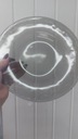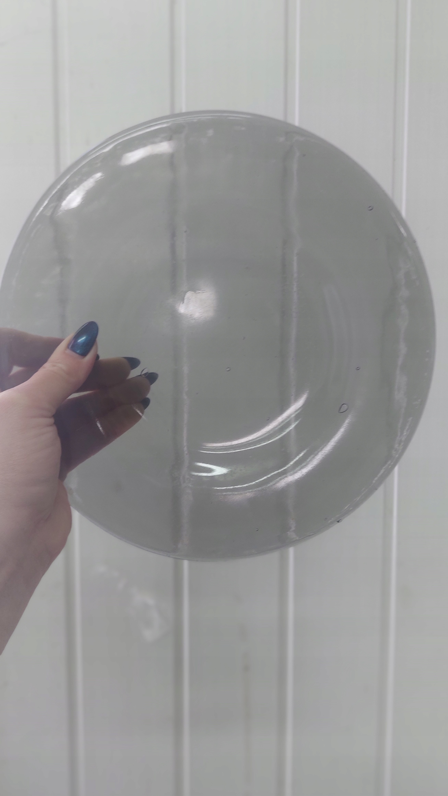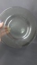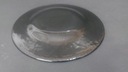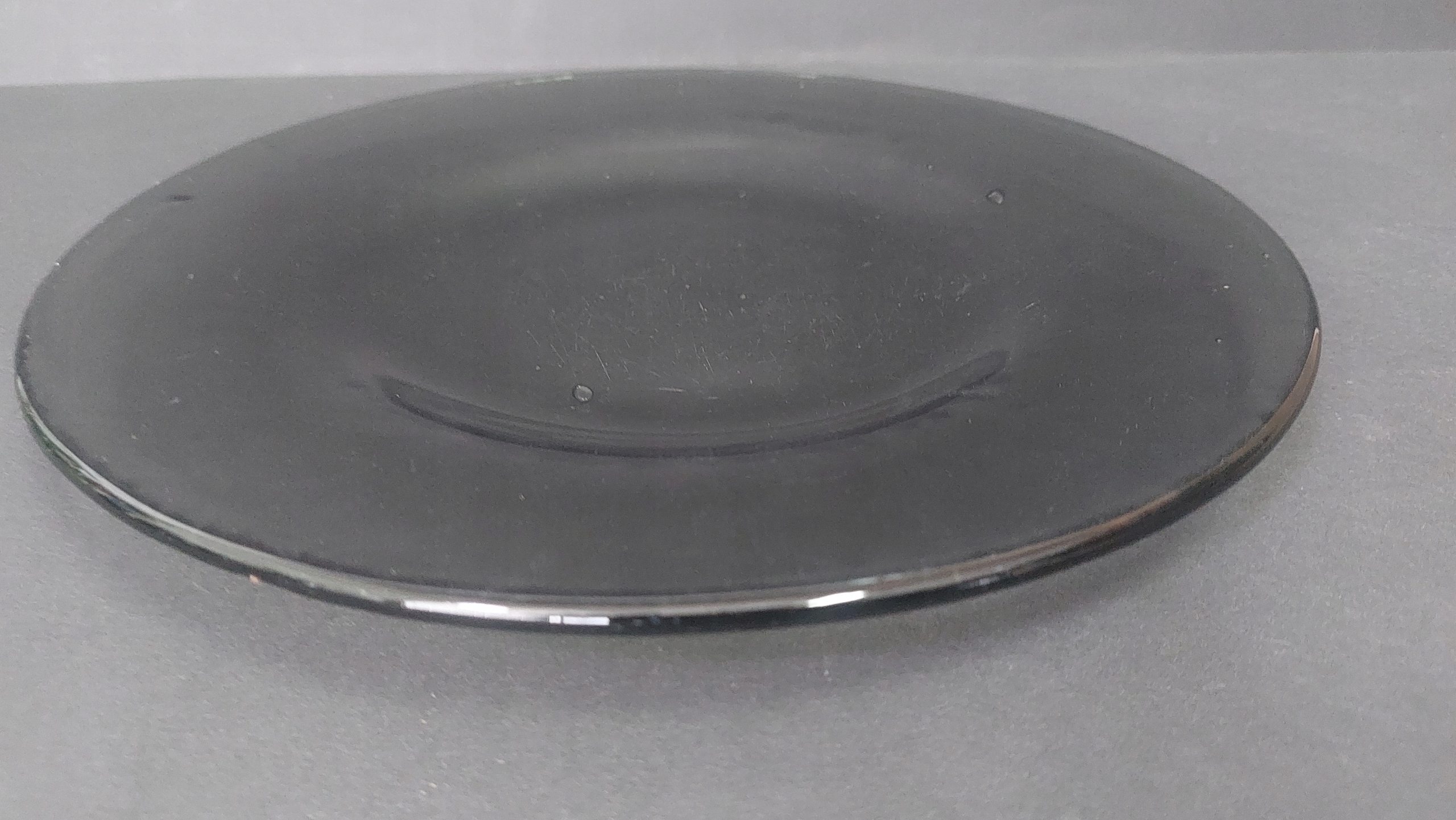 Talerz, wykonany z grubego prasowanego szkła artystycznego w odcieniu zgaszonej zieleni.