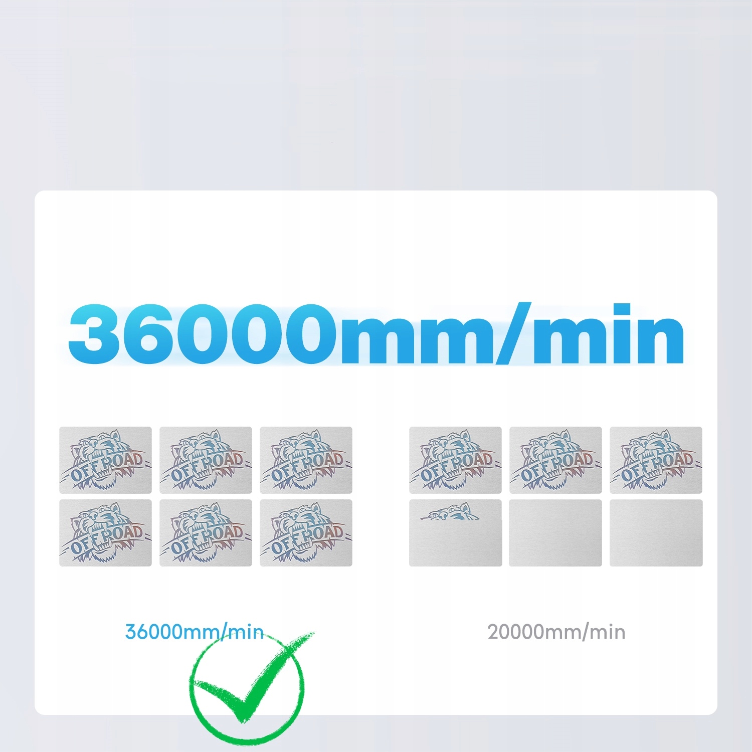 Laser B1 jest wyposażony w nową 32-bitową płytę główną, która umożliwia grawerowanie z prędkością do 36,000 mm/min, czyli czterokrotnie szybciej niż zwykłe grawerki laserowe. Wykorzystuje również cichy kontroler TMC2209, który skutecznie redukuje hałas pracy, zapewniając szybsze i przyjemniejsze wrażenia.