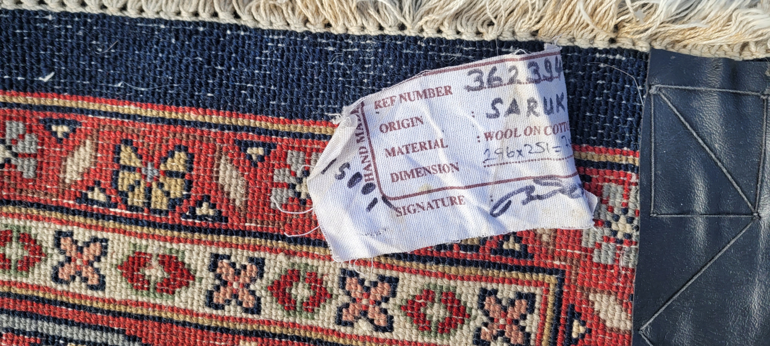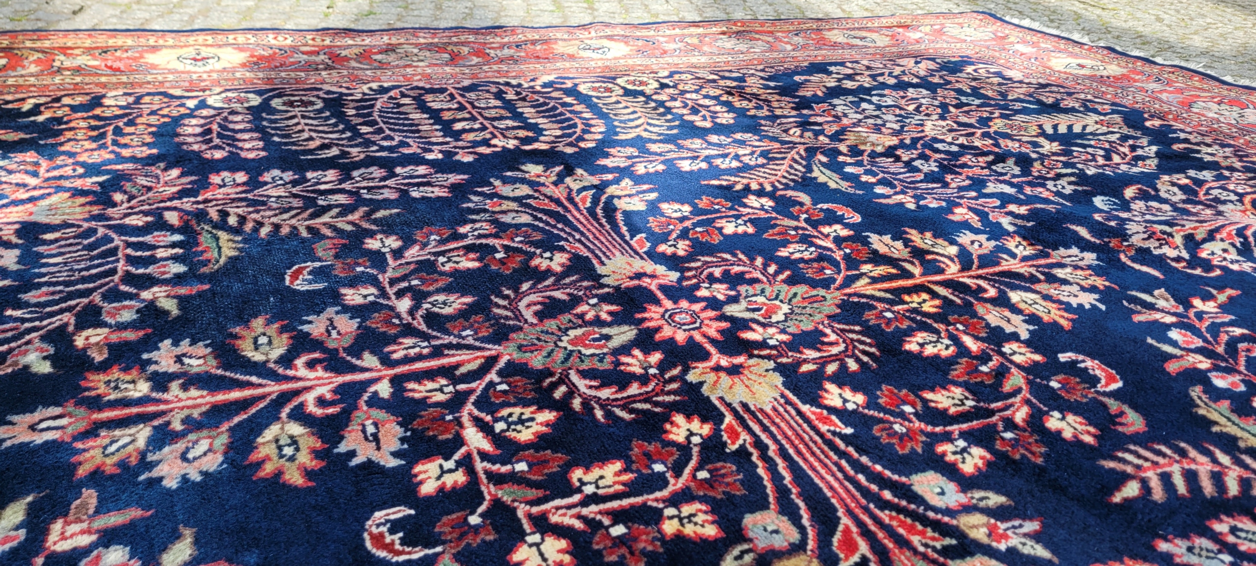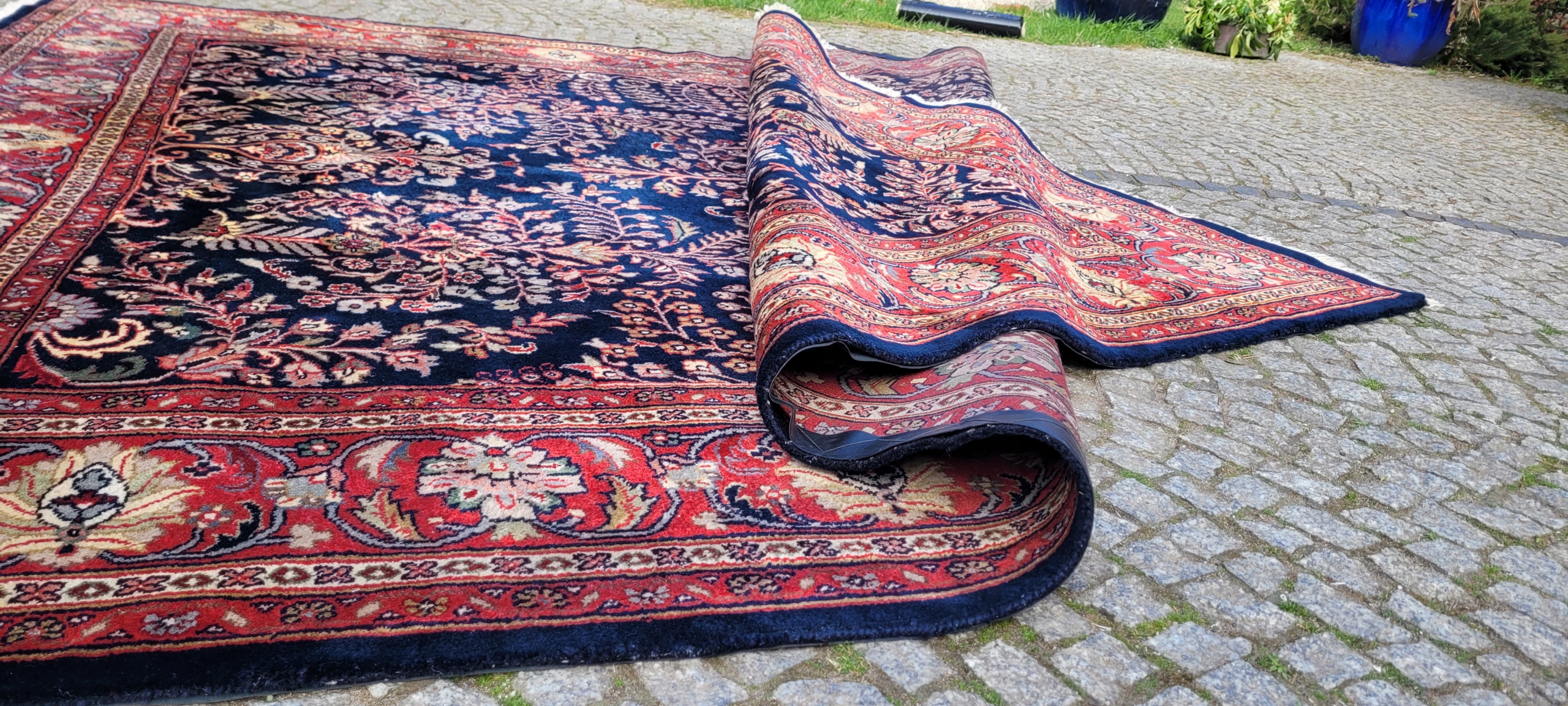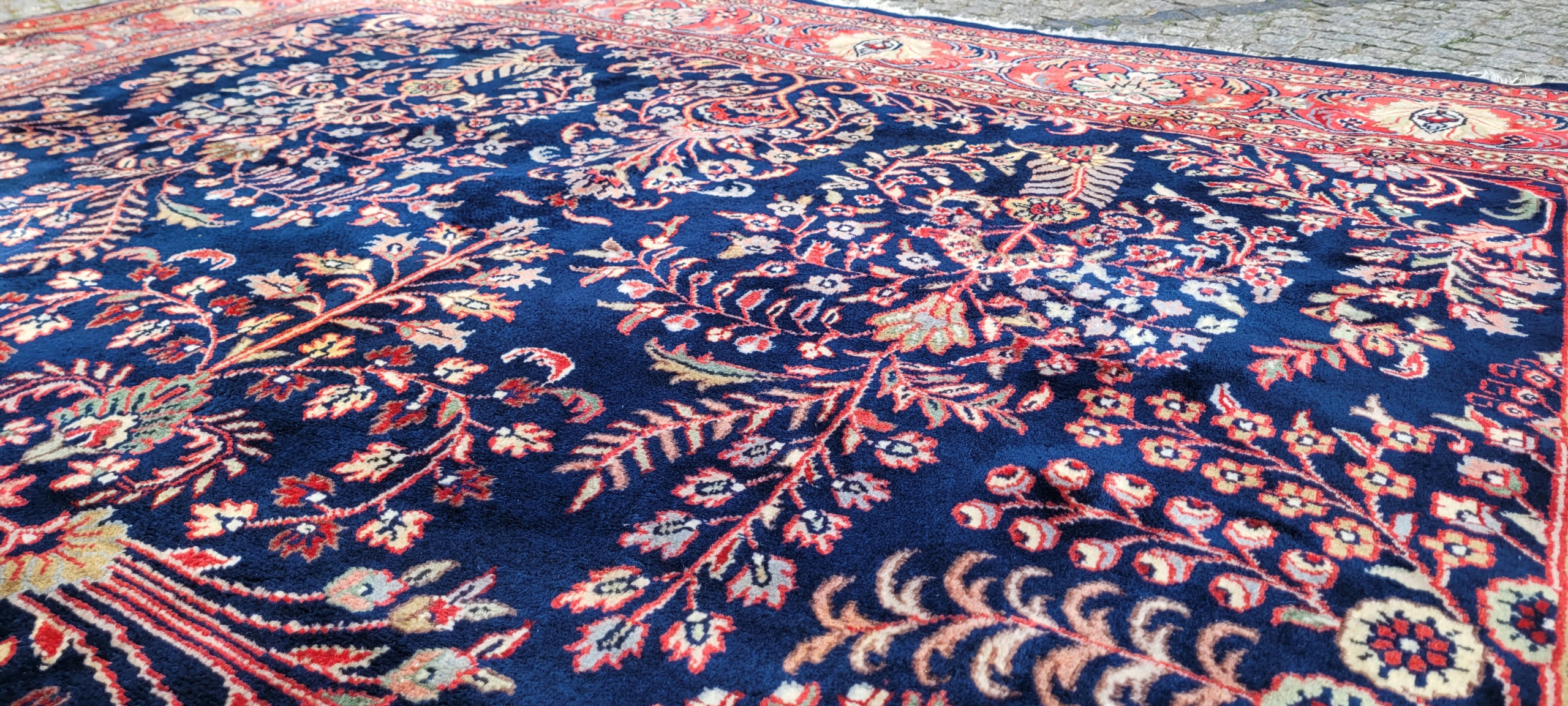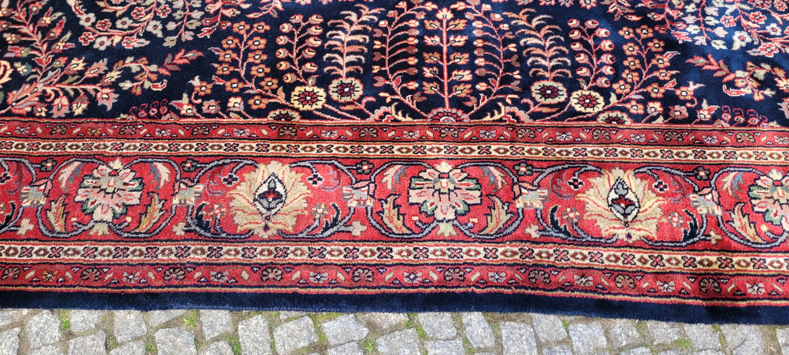 Perski dywan Saroug. Tkany ręcznie z najwyższej jakości wełny. Charakteryzuje się zwartym, przyjemnym w dotyku, lśniącym runem oraz piękną kolorystyką i wzornictwem. Jest zachowany w stanie dobrym.