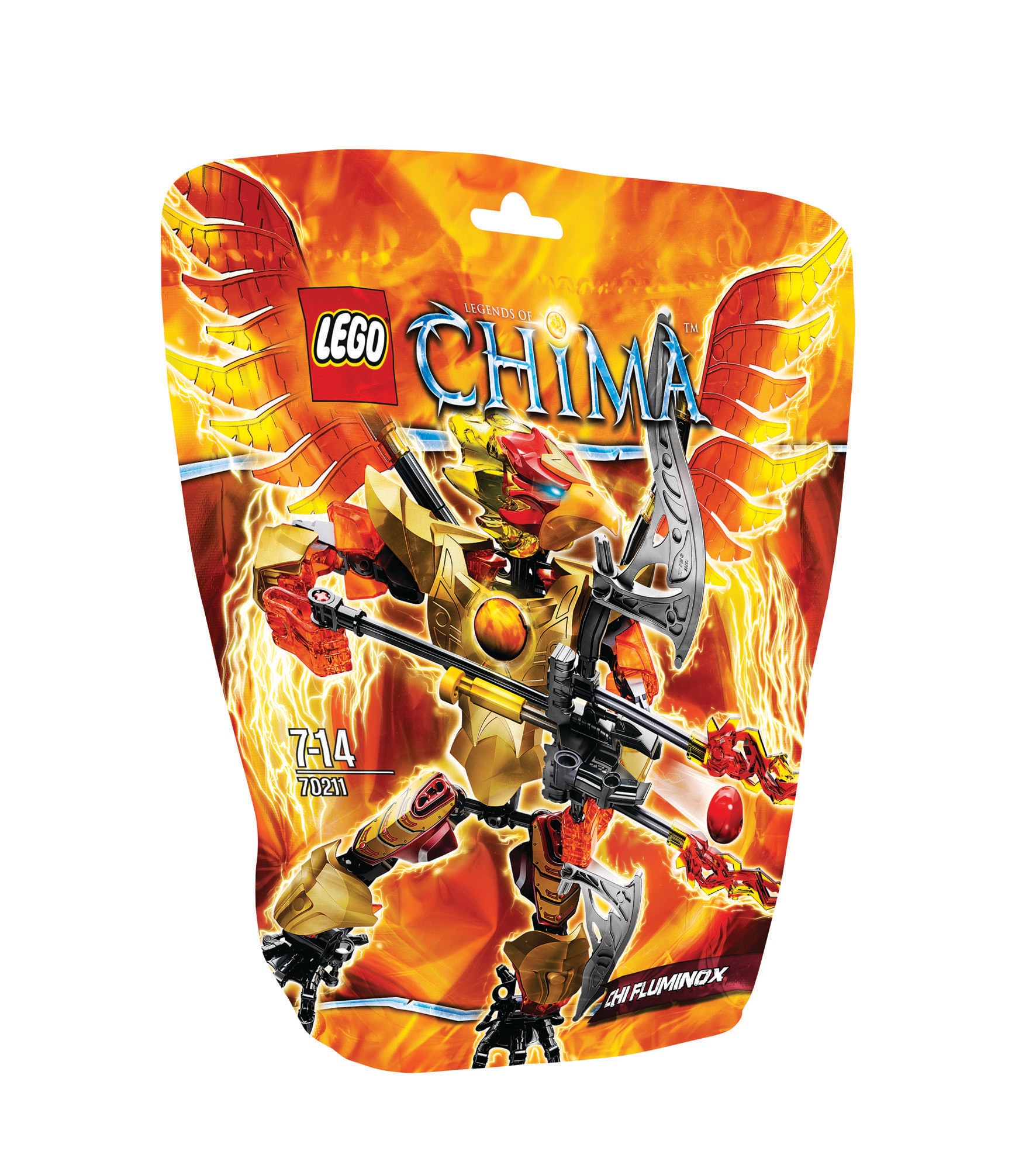 Dzięki mocy CHI Fluminox zostaje przekształcony w ognistego wojownika do budowania. Duże ogniste skrzydła i elastyczne kończyny sprawiają, że przywódca plemienia Feniksów jest wyjątkowo zwinny podczas walki. Złota zbroja dodaje mu blasku, a w napierśniku ma ukryte ogniste CHI. Do ataku używa ostrych pazurów i dużej kuszy płomienia. Zestaw przeznaczony jest dla dzieci w wieku od 7 lat i zawiera 91 elementów, w tym: - Elementy potrzebne do zbudowania Fliminoxa z elastycznymi kończynami, złotą zbroją, CHI w klatce piersiowej i przezroczystym dziobem, - Olbrzymie ogniste kusze; - Pojedynki z CHI Sir Fangarem z zestawu 70212; - Połącz z CHI Laval z zestawu 70206 zgodnie z instrukcją pod linkiem, aby zbudować jeszcze większą figurkę CHI Fliminoxa; - Wysokość ok. 22 cm;