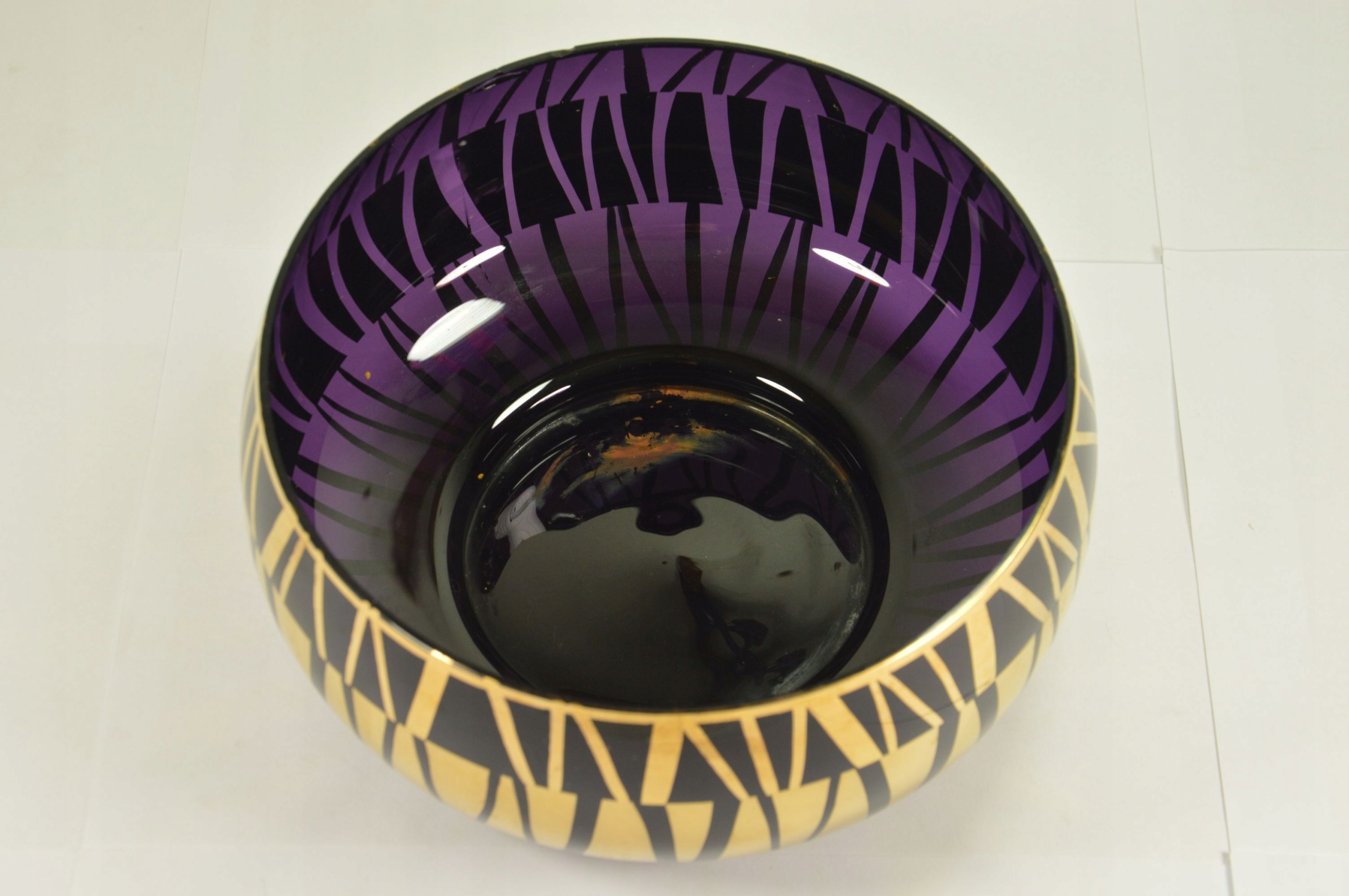Bohemia piękna, złocona, szklana misa w kolorze kobaltowym. Misa posiada wyszczerbienie oraz pęknięcie widoczne na zdjęciach nr 3 i 4. Misa jest funkcjonalna, doskonale się prezentuje w tym zdobieniu. Sygnatura na odwrocie.