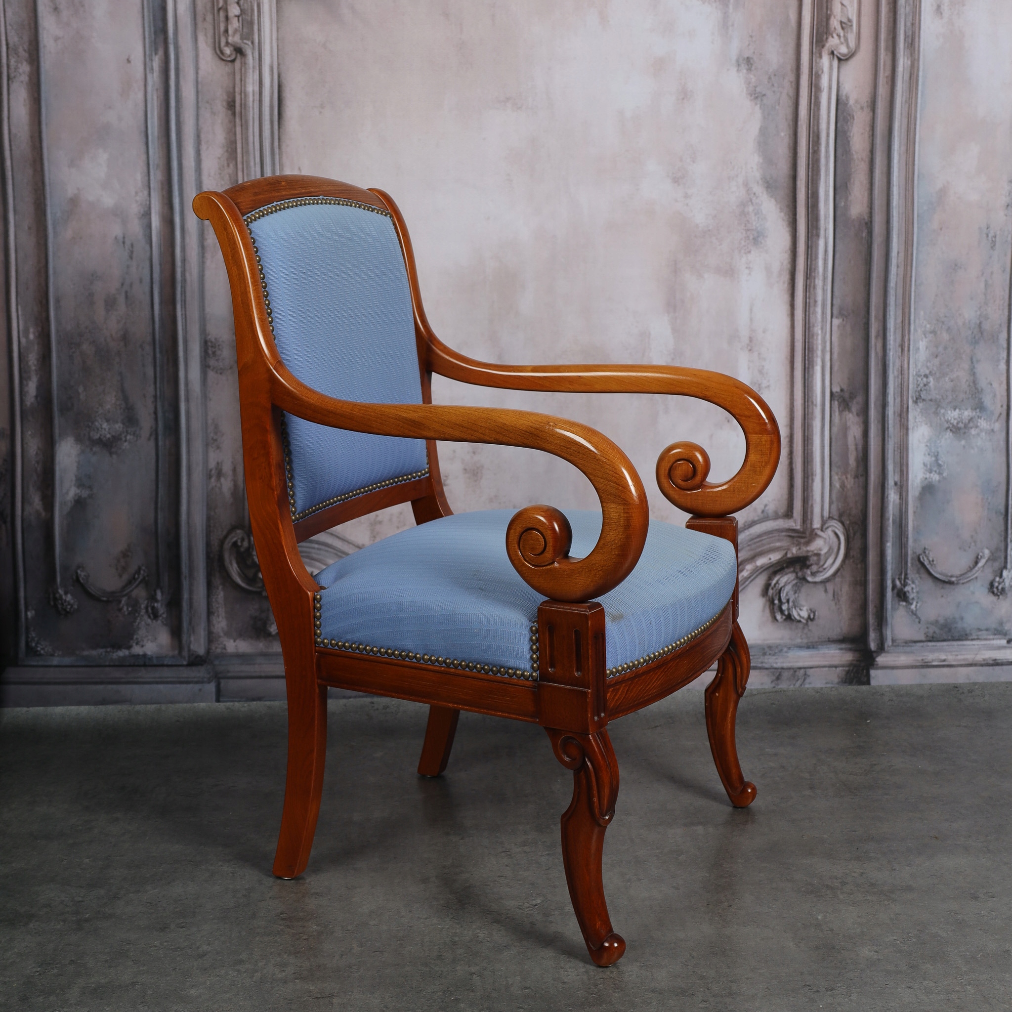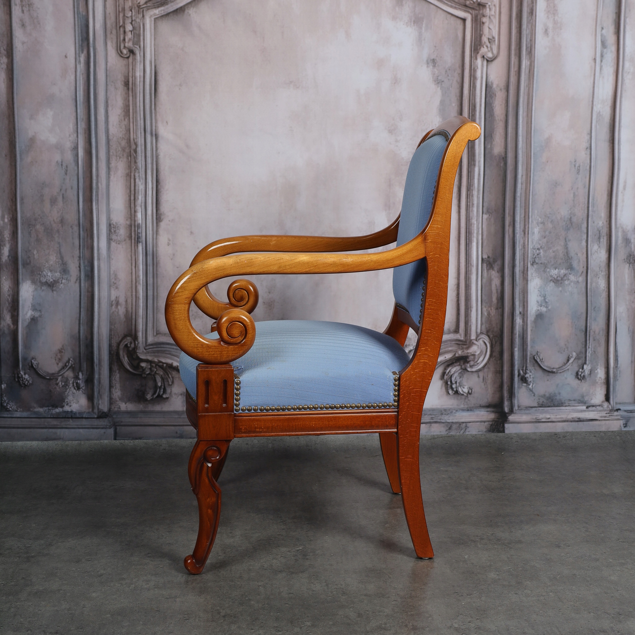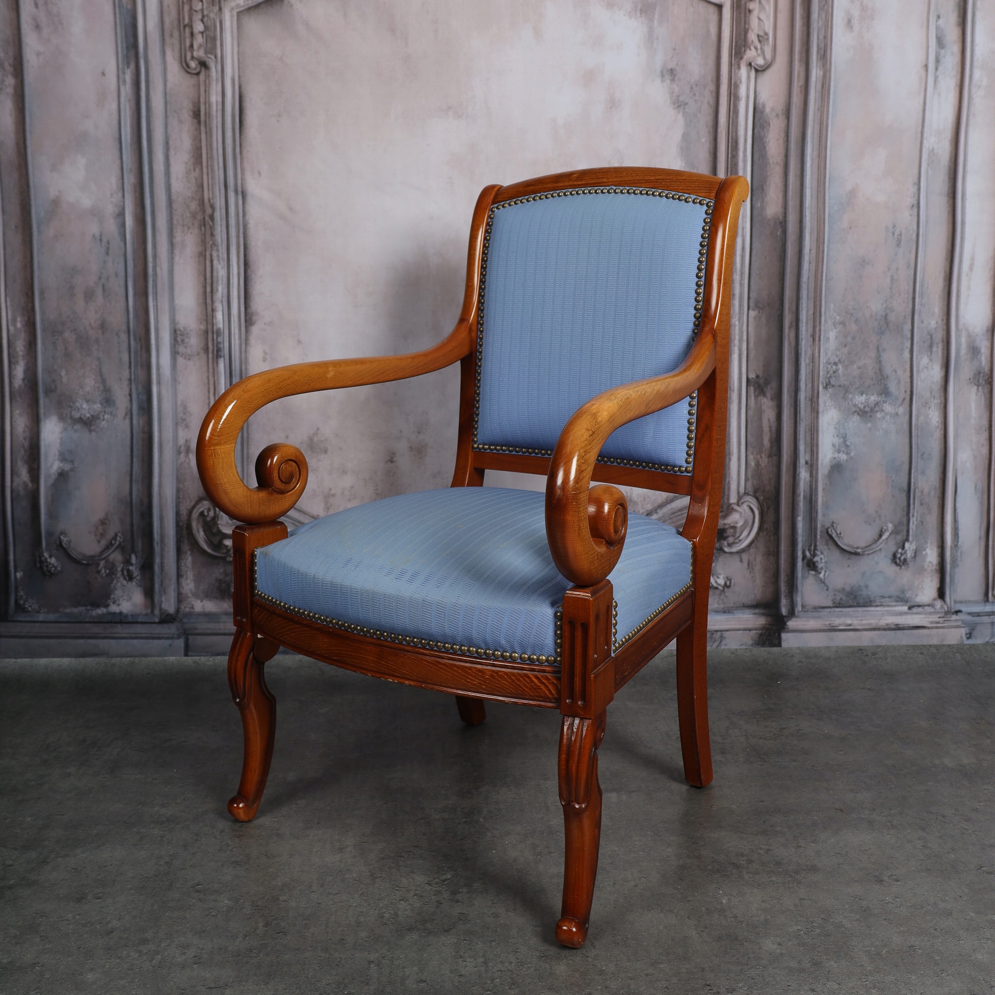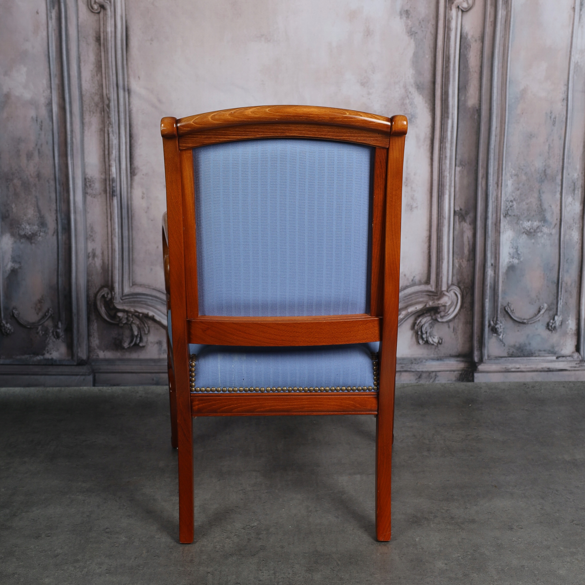 Elegancki fotel z II połowy XX wieku. Fotel wyróżnia się klasycznym designem, który idealnie wpasuje się w eleganckie wnętrza, dodając im szyku i wyjątkowego charakteru.