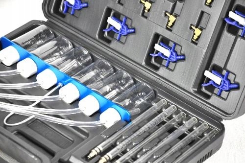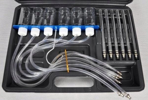 Przelewowy zestaw diagnostyczny do wtryskiwaczy COMMON RAIL. Na wyposażeniu miernika znajdują się końcówki do wszystkich produkowanych aktualnie systemów Common Rail t.j.: Bosch, Denso, Delphi i Siemens.