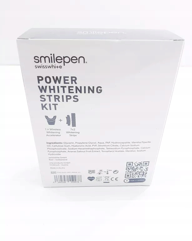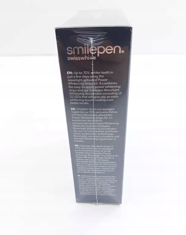 Zestaw Smilepen Power Whitening do domowego wybielania zawiera akcelerator LED z diodami w dwóch widmach barw (długości fali), 3 wybielające pisaki żelowe i 1 żel Smilepen Care. Już po pierwszym tygodniu stosowania widoczne jest rozjaśnienie i redukcja płytki nazębnej. Połączenie promieniowania UV z ciepłem i innowacyjną formułą PAP jest bardzo skuteczne. Akcelerator zawiera 32 diody LED.