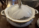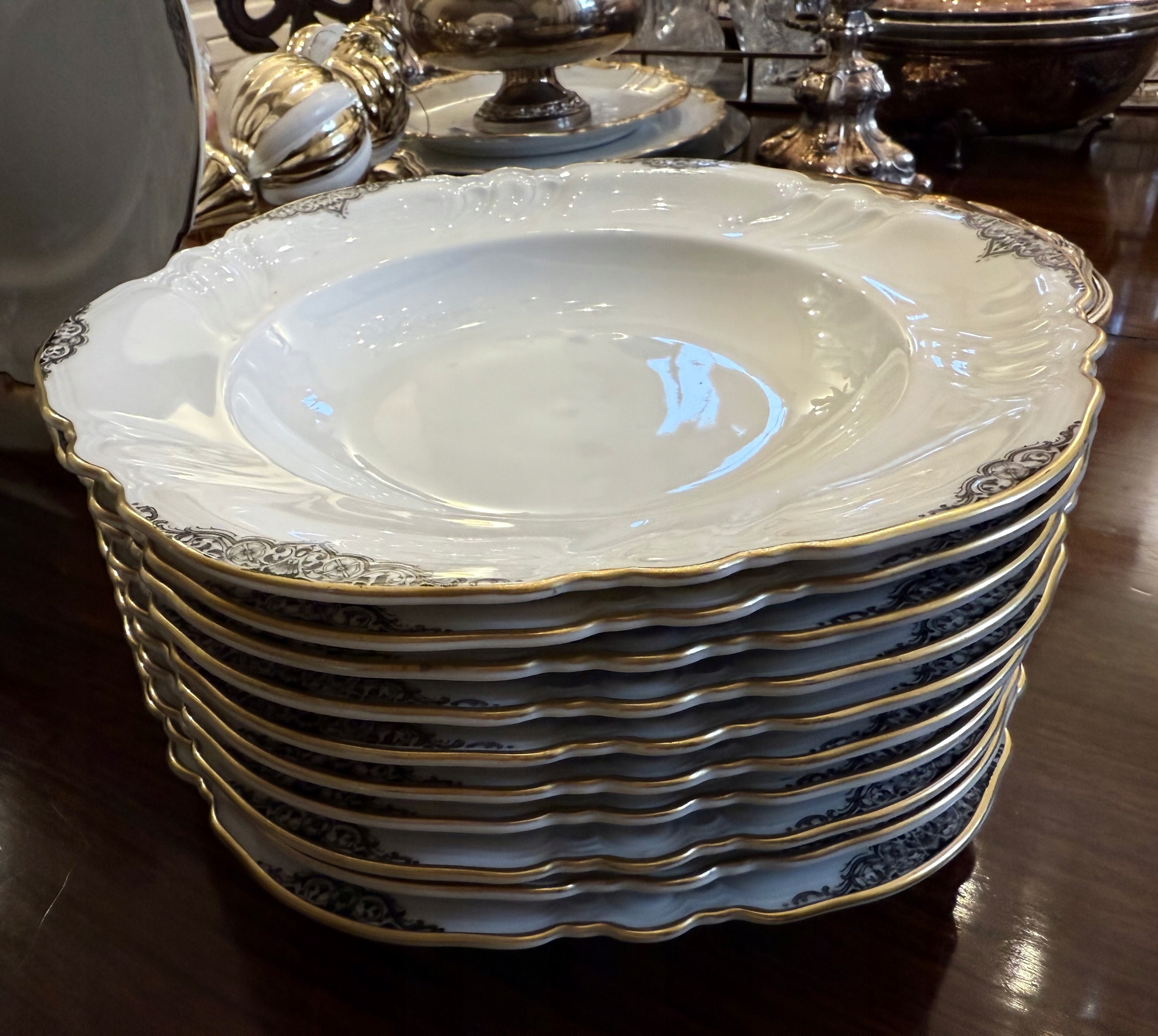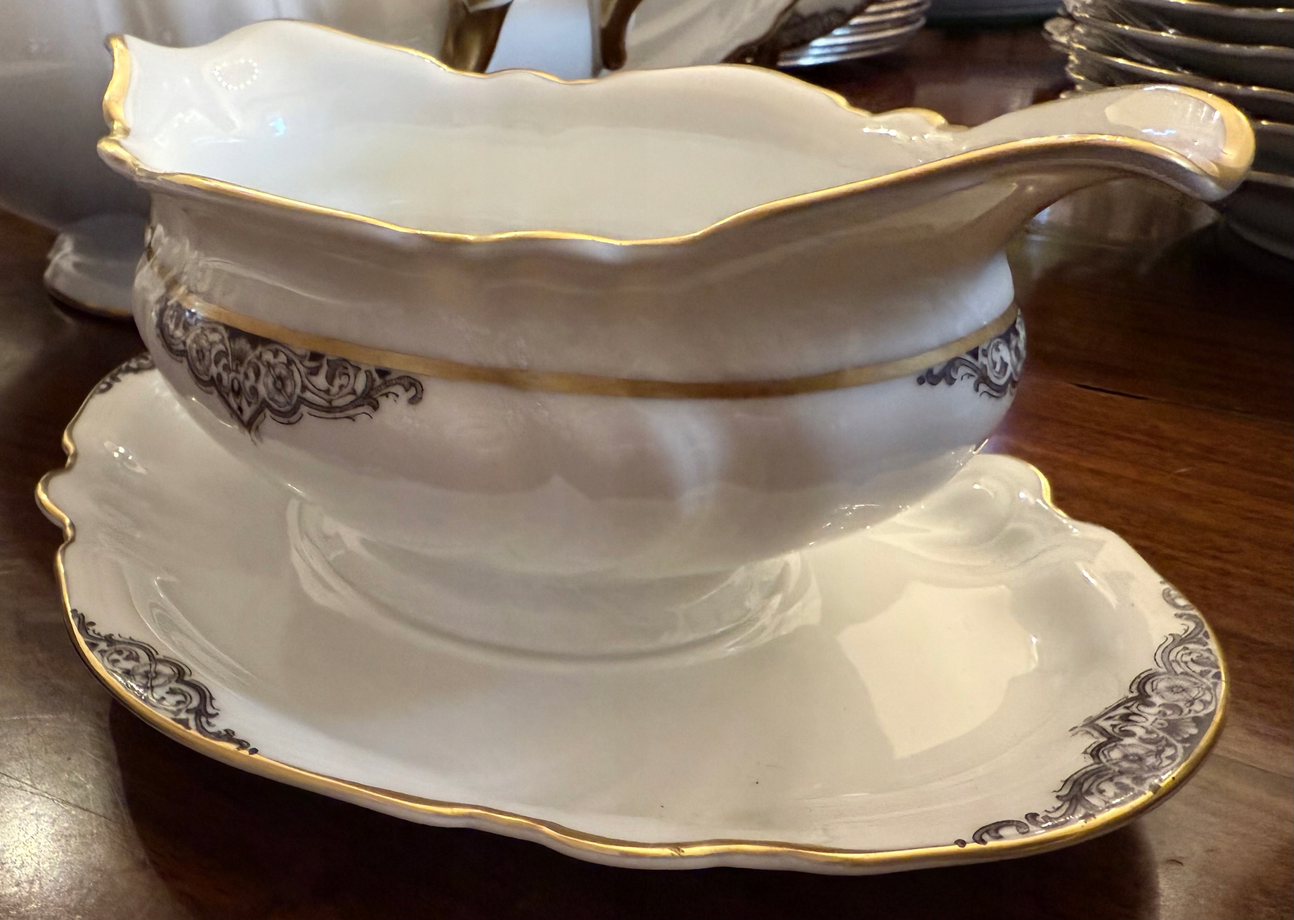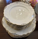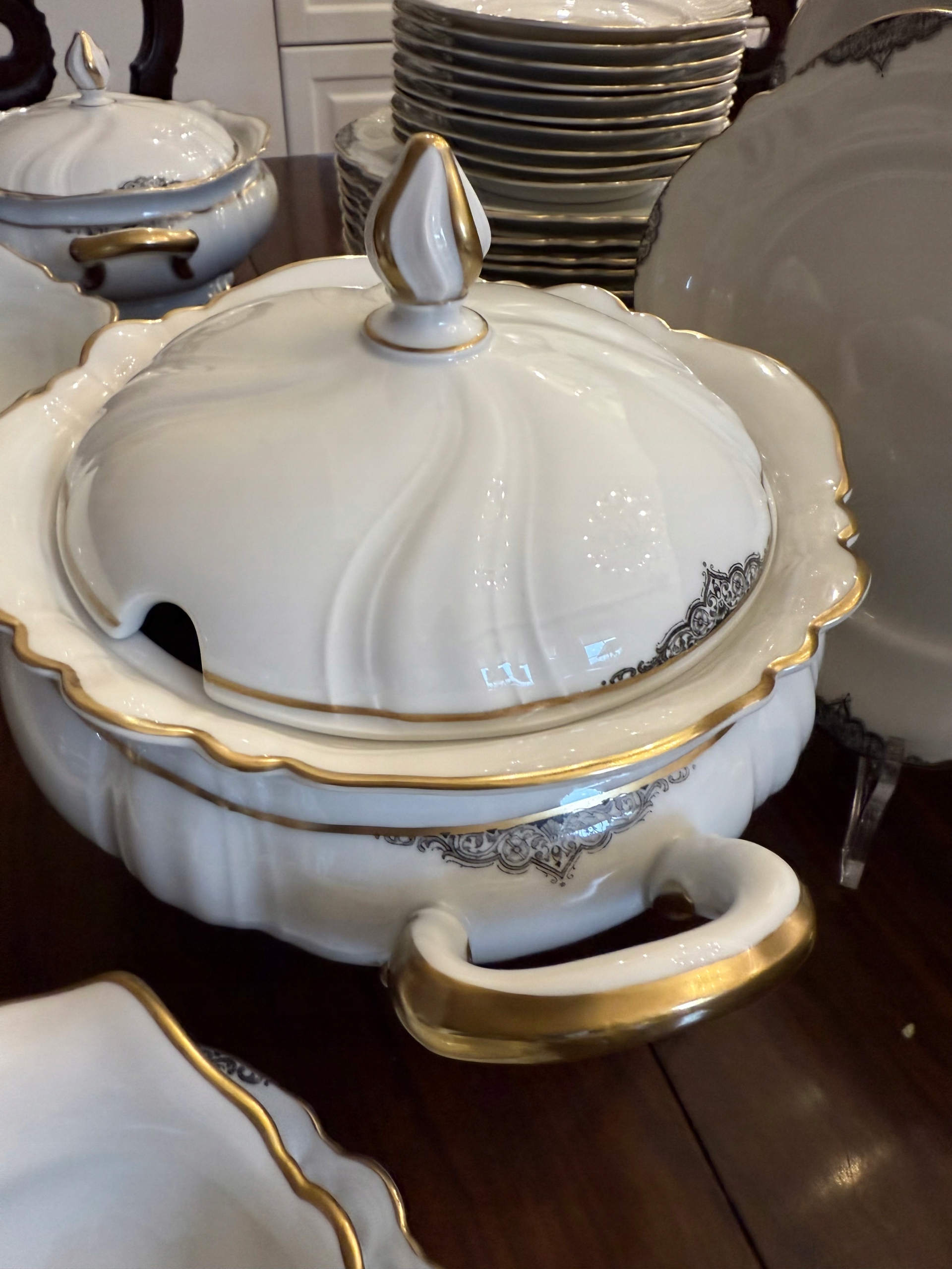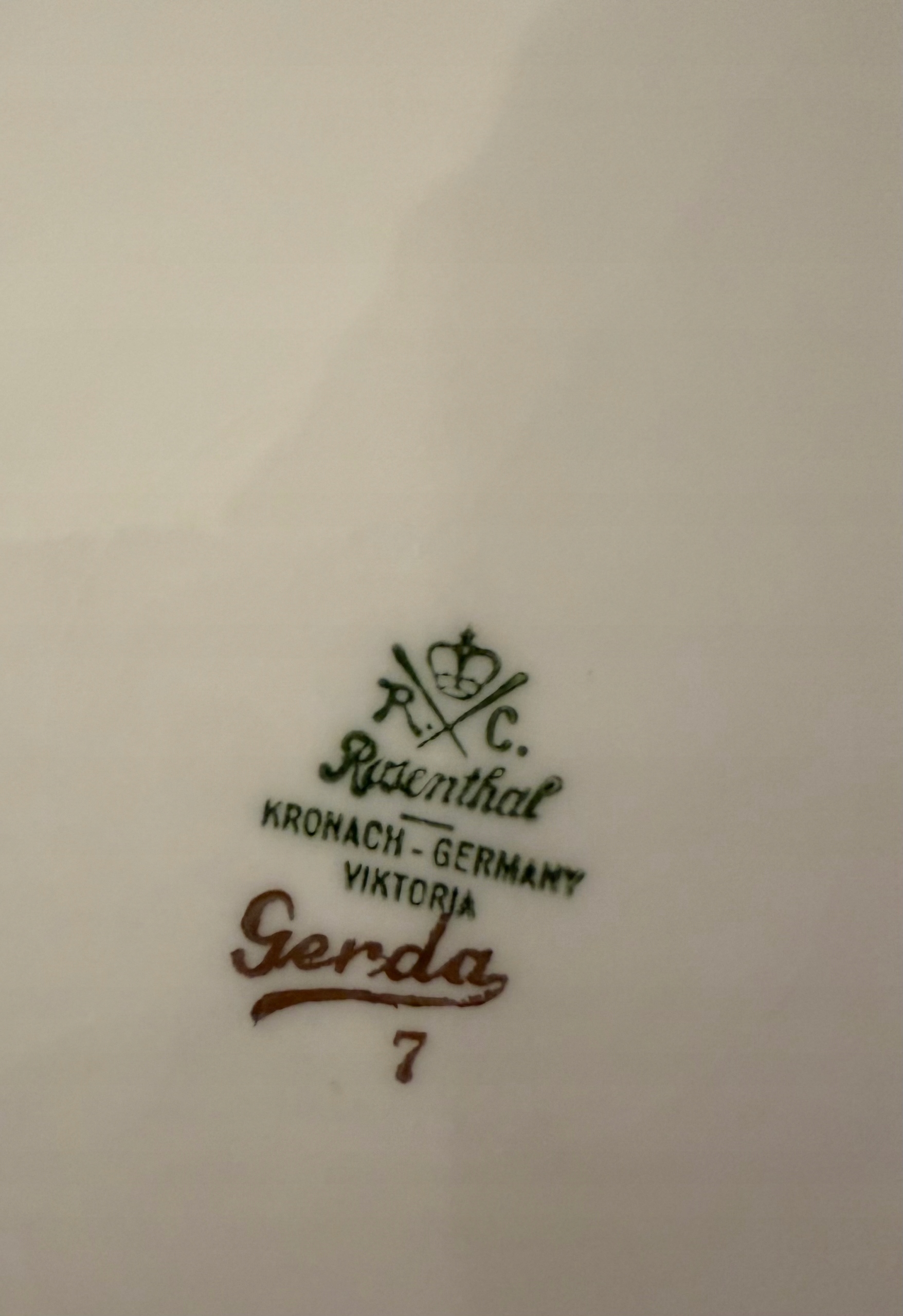 Rosenthal Viktoria model Gerda. Śnieżnobiała porcelana wspaniale zdobiona reliefami, złoceniami i dodatkowo pięknym wzorem. Stan serwisu gablotowy.