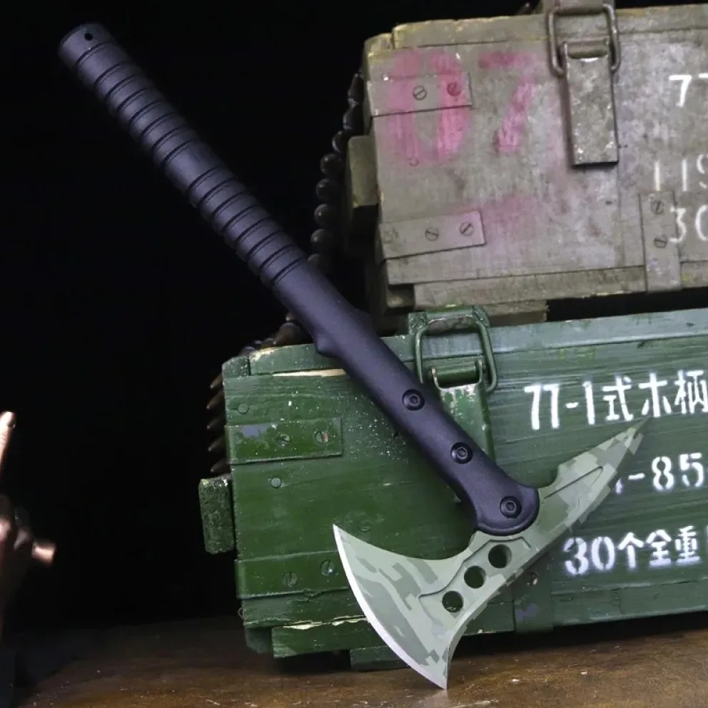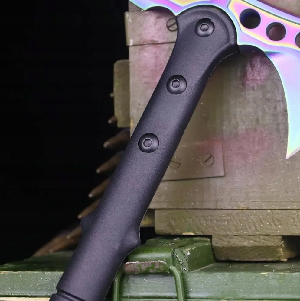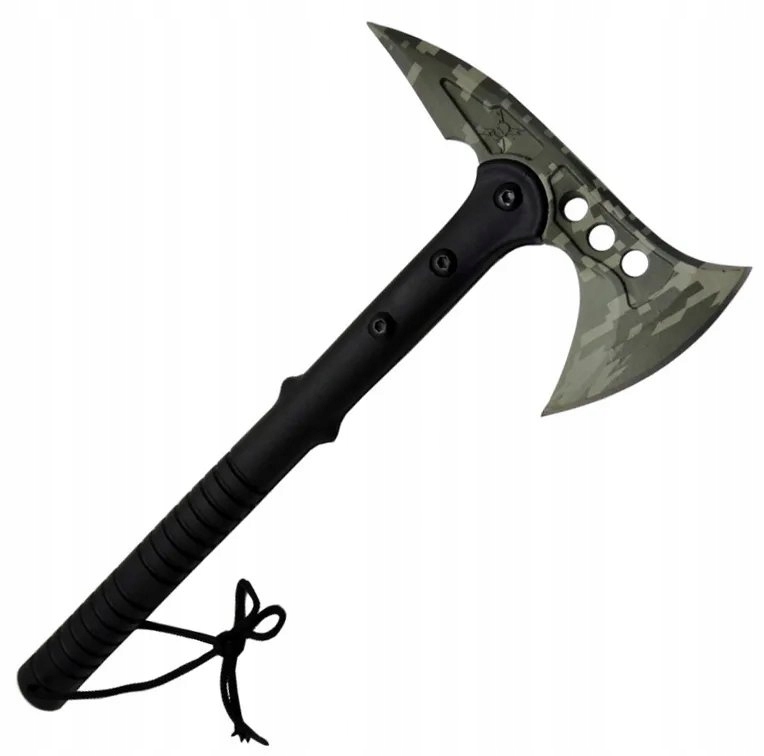 Toporek posiada rękojeść wykonaną z powierzchni antypoślizgowej ABS, oraz posiada otwór do którego możemy dowiązać sznurek i zabezpieczyć go na nadgarstku.