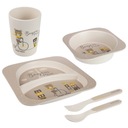 Zestaw naczyń został wykonany z solidnych, odpornych, nietłukących się i odpowiednich do kontaktu z pożywieniem materiałów, z wykorzystaniem naturalnych surowców– 50% mączki drzewnej i 30% jadalnej skrobi kukurydzianej (oraz 20% żywicy melaminowej).