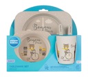 W zestawie znajduje się: talerz, miska, kubek oraz sztućce – widelec i łyżka. Sztućce są z zaokrąglonymi brzegami, dzięki czemu są bezpieczne dla ust i delikatnych dziąseł dziecka.
